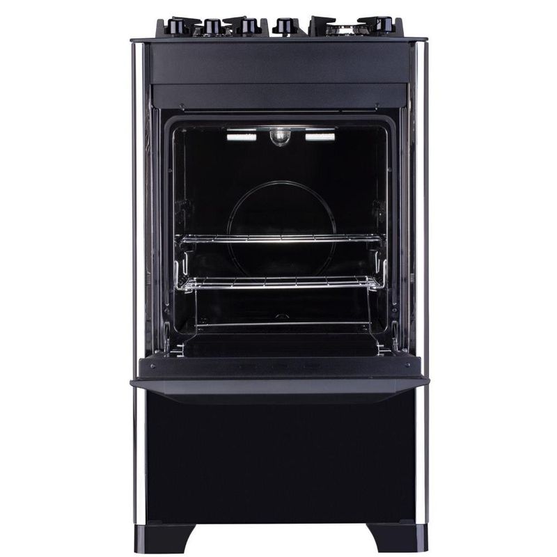 Design moderno com mesa de vidro top control, acendimento automático, grades de ferro fundido com 6 pontos de apoio - que proporcionam maior segurança e firmeza para as panelas, bordas laterais em inox, puxador amplo e ergonômico e pés robustos. O forno possui um mega visor - que permite enxergar tudo o que está dentro, excelente capacidade de 60 litros, acabamento limpa fácil, iluminação interna (lâmpada acompanha o produto), 1 grade autodeslizante e 1 deslizante e porta com vidro duplo - que preserva o calor. Com isolamento térmico (lã de basalto), que deixa o produto MUITO mais econômico.Ficha Técnica:Voltagem: BivoltPadrão de Tomada: 10ACor: PretoQuantidade de Bocas: 4 bocasTipo de Acendimento: AutomáticoGarantia: 12 MesesAcabamento da Mesa: Vidro TemperadoTurbo Convecção: NãoDimensões do Produto (largura x altura x profundidade) 51,5 x 94,2 x 63,8 cmDimensões Internas do Forno (largura x altura x profundidade) 37 x 36 x 45 cmGrill: NãoFuncionamento: GásCapacidade do Forno: 60 LitrosAcabamento do Forno: Limpa FácilLuz no Forno: Sim Vidro do Forno: Vidro DuploTrempes: Individual de ferro fundido com 6 pontos de apoioGrades do Forno: 1 Grade deslizante e 1 auto deslizanteBotões Removíveis: SimFabricação: NacionalPotência dos Queimadores: 2Q Ramal de 1,7kW, 1Q Família de 2,0kW e 1Q Mega Chama de 3,0kWSistema Corta/Bloqueia Gás: SimEficiência Energética: A *Não vendemos para CNPJ neste canal de vendas. Compras realizadas com CNPJ serão automaticamente canceladas.
