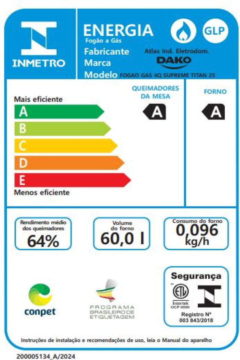 Comprar um fogão Dako é investir no que há de mais moderno e eficiente, com um preço que vai te surpreender!Os tempos mudaram e o Supreme Inox também. Ele continua compacto por fora e gigante por dentro. Afinal, até os sucessos merecem ser reinventados.Tenha mais agilidade no preparo das refeições com a praticidade que você merece. Moderno, seguro e eficiente, o fogão Dako Supreme Inox é ideal para todos os estilos de cozinha. A versão de 4 bocas conta com queimadores potentes, garantindo um preparo rápido, enquanto as grades duplas de aço oferecem firmeza e estabilidade para suas panelas. O puxador em alumínio escovado, além de ergonômico, dá um toque de sofisticação no design. A prateleira deslizante torna ainda mais fácil colocar e retirar suas receitas com total praticidade. O visor amplo do forno permite acompanhar o preparo sem precisar abrir a porta, e o acabamento Limpa Fácil deixa a limpeza ainda mais rápida e descomplicada.Ter um Fogão Dako Supreme é transformar a cozinha no coração da sua casa. É sentir o prazer de preparar refeições deliciosas com a confiança de estar utilizando um fogão que alia qualidade e inovação. Poucas coisas funcionam tão bem quanto um Fogão Dako Supreme Inox.Você vai perceber: Na hora de comprar, a Dako surpreende!Ficha Técnica: Voltagem: BivoltPadrão de Tomada: 10ACor: TitaniumLinha: SupremeQuantidade de Bocas: 4 bocasTipo de Acendimento: AutomáticoGarantia: 12 MesesAcabamento da Mesa: InoxInstalação: Fogão de PisoTurbo Convecção: NãoDimensões do Produto (largura x altura x profundidade): 52,8 x 96,0 x 64,2 cmComprimento do Cabo de Energia: 96 cmFuncionamento: GásCapacidade do Forno: 60 LitrosAcabamento do Forno: Limpa FácilLuz no Forno: Sim (lâmpada de 220v acompanha o produto)Vidro do Forno: Vidro DuploTampa: SimTrempes: Duplas de Aço Grades do Forno: 1 Grade deslizantesTimer Digital: NãoBotões Removíveis: SimFabricação: NacionalPotência dos Queimadores: 1Q Família de 2,0kW, 1Q Mega Chama de 2,5kW e 2Q Semi-Rápido de 1,7kWSistema Corta/Bloqueia Gás: SimEficiência Energética: AEAN: 7897180599324