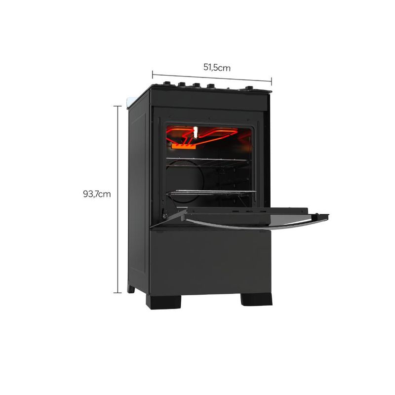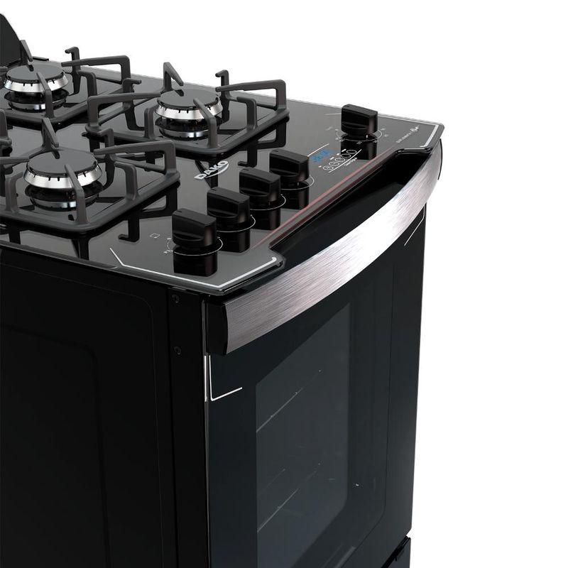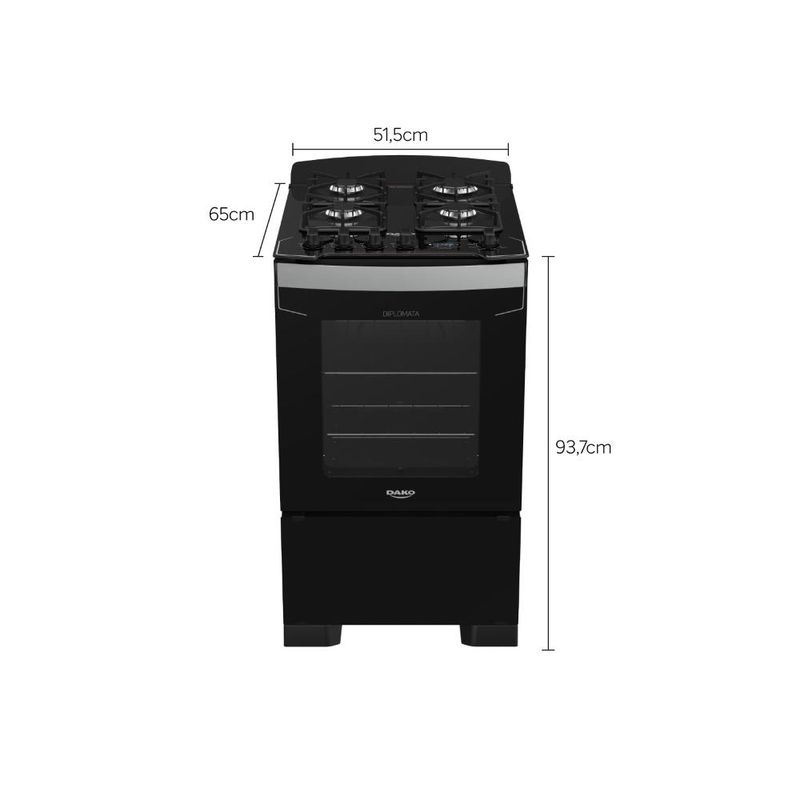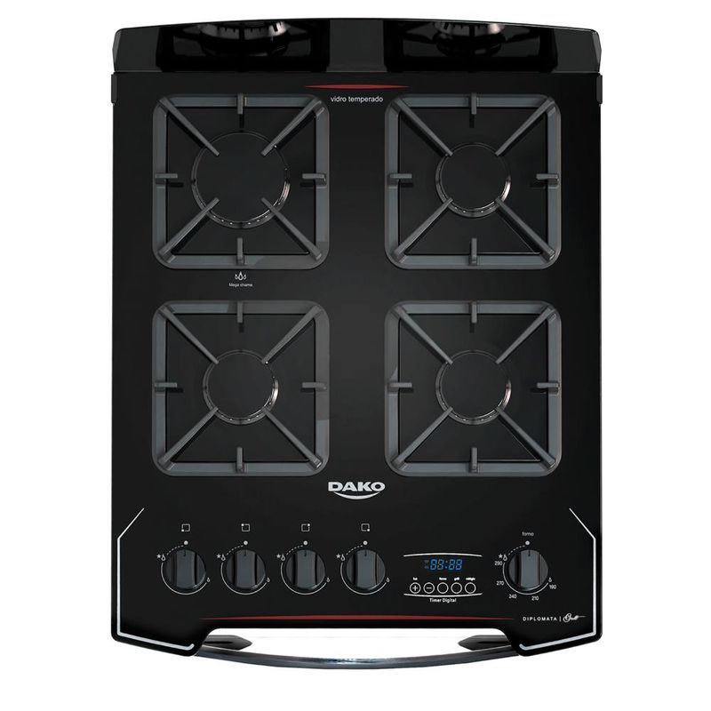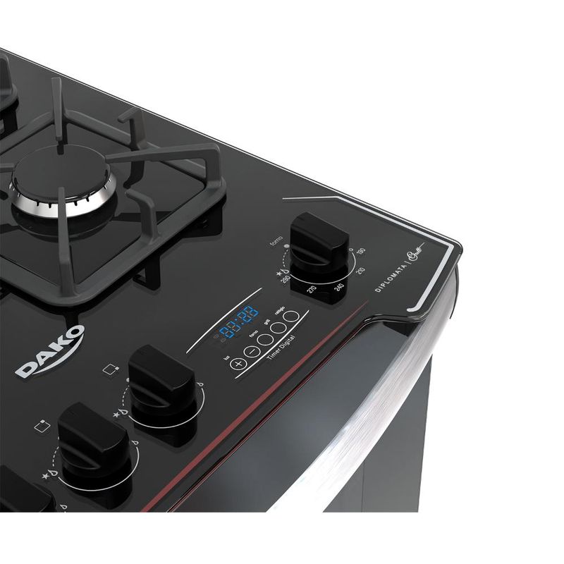 O fogão Dako Diplomata Grill combina design moderno com frente total em vidro preto e várias características diferenciadas. Destaca-se pelo timer digital, testeira anti-resíduos em vidro temperado removível, mesa de vidro temperado com recorte frontal, grades de ferro fundido quadradas com 8 pontos de apoio, puxador de alumínio escovado, pés robustos e fixos, além de botões ergonômicos.Na versão de 4 bocas, o fogão inclui 3 queimadores semirrápidos de 1,7kW e 1 queimador rápido de 3,0kW. O forno tem capacidade de 60 litros, grill e dourador elétrico, acabamento "Limpa Fácil", iluminação interna (lâmpada inclusa), 1 grade autodeslizante, 1 deslizante, e porta com vidro duplo para melhor retenção de calor. Ficha Técnica: Voltagem: Bivolt Cor: Preto Linha: Diplomata Bocas: 4 bocas Acendimento: Superautomático Garantia: 12 meses Acabamento da Mesa: Vidro temperado Instalação: Fogão de piso Dimensões: 51,5 x 93,7 x 65 cm (L x A x P) Grill: Sim Funcionamento: Gás Capacidade do Forno: 60 litros Luz no Forno: Sim (lâmpada inclusa) Vidro do Forno: Vidro duplo Trempes: Ferro fundido com 8 pontos de apoio Grades do Forno: 1 autodeslizante e 1 deslizante Botões Removíveis: Sim Sistema Corta/Bloqueia Gás: Sim Eficiência Energética: A Comprimento do Cabo de Energia: 96 cm *Não vendemos para CNPJ neste canal de vendas. Compras realizadas com CNPJ serão automaticamente canceladas.