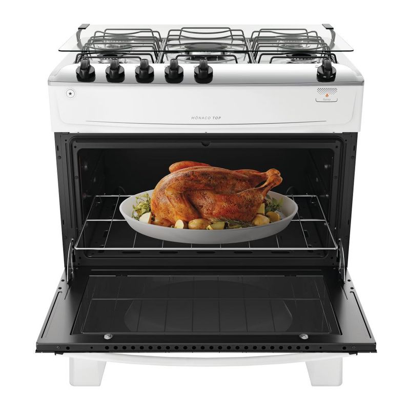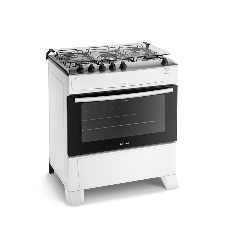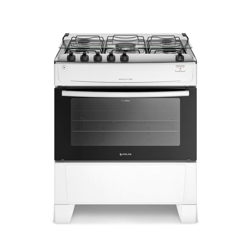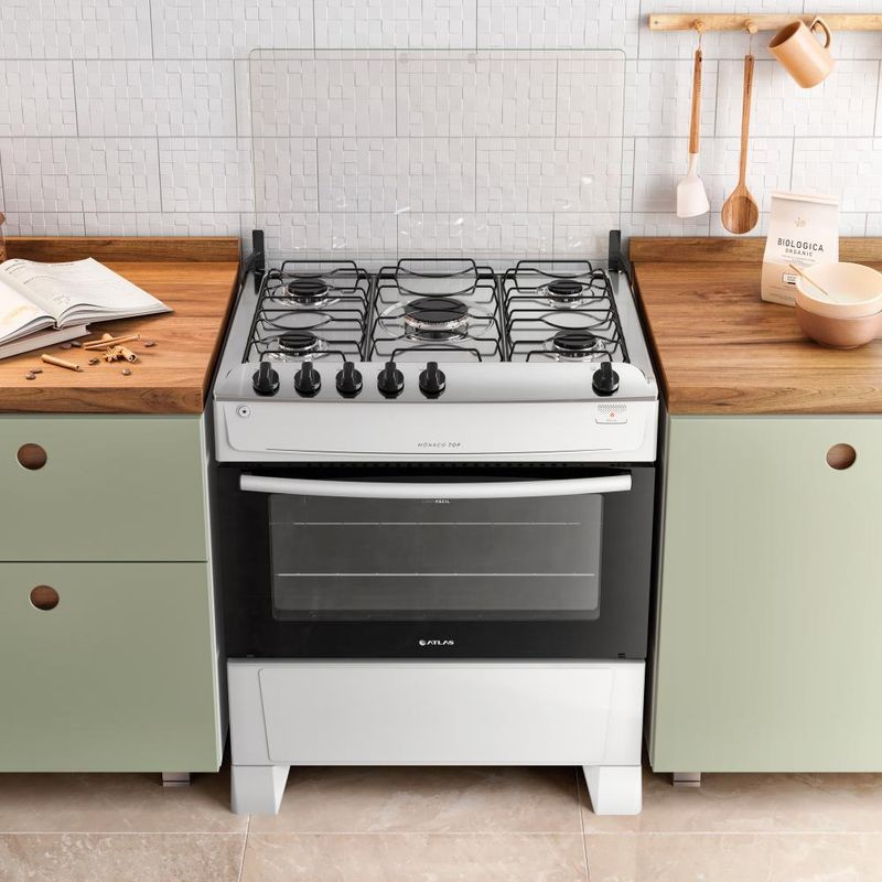 O Fogão Mônaco Top da Atlas, na versão 5 bocas com mesa de inox, oferece durabilidade, economia e praticidade. Com painel na mesa, grades de aço reforçadas, pés altos para fácil limpeza, acendimento automático, visor amplo no forno com porta de vidro e revestimento Limpa Fácil. Inclui 2 queimadores semirrápidos, 2 rápidos, 1 Mega Chama e um espaçoso forno de 86,5 litros. É a escolha perfeita para quem busca um fogão bonito, econômico e eficiente. Confira demais características do produto:Voltagem: BivoltPadrão de Tomada: 10ACor: BrancoQuantidade de Bocas: 5 bocasTipo de Acendimento: AutomáticoGarantia: 12 MesesAcabamento da Mesa: InoxInstalação: Fogão de PisoDimensões do Produto (largura x altura x profundidade): 76,16 x 89,63 x 58,16 cmComprimento do Cabo de Energia: 96 cmFuncionamento: GásCapacidade do Forno: 86,5 LitrosAcabamento do Forno: Limpa FácilLuz no Forno: Não possuiVidro do Forno: Vidro DuploTampa: SimTrempes: Dupla de aço esmaltadoGrades do Forno: 1 Grade deslizanteBotões Removíveis: SimPotência dos Queimadores: 2Q Semirrápido de 1,67kW, 2Q Rápido de 2,0kW e 1Q Mega Chama de 3,0kWSistema Corta/Bloqueia Gás: SimEficiência Energética: AEAN: 7897180510084- A conversão de gás é gratuita, se solicitada em até 90 dias após o recebimento do produto;- Não realizamos serviço de instação. Consulte nosso SAC para indicações de assistências técnicas credenciadas na sua região;- Não vendemos para CNPJ nesse canal, por favor finalize sua compra com um CPF.
