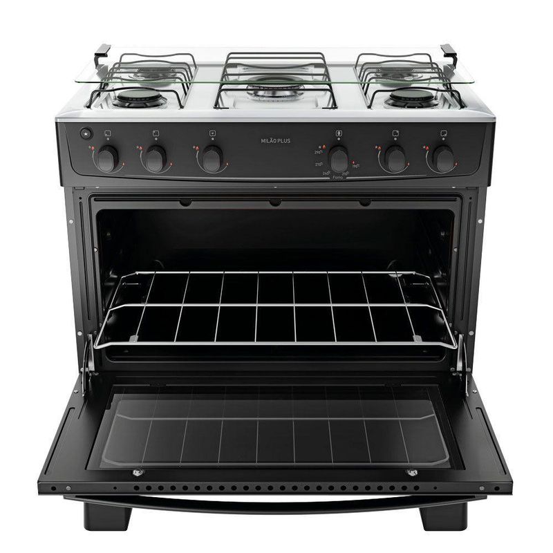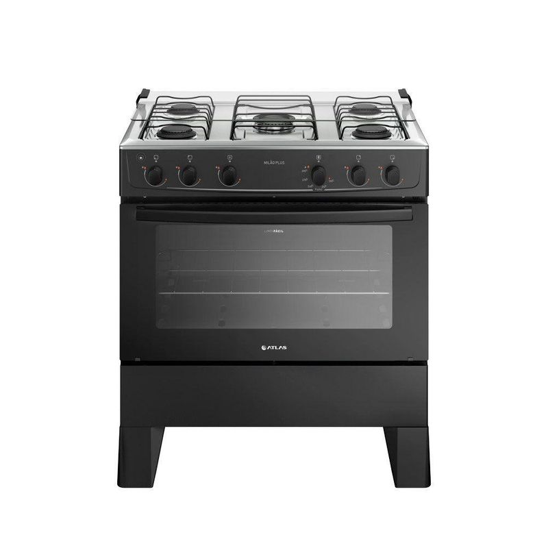 Fogão 5 Bocas Com Mesa Inox Milão Plus 300001773 Atlas Preto BivoltApresentamos o Fogao 5 Bocas com Mesa Inox Milao Plus 300001773 da Atlas. O Fogao Atlas Milao Plus e uma excelente escolha para sua cozinha, combinando praticidade e estilo. Com uma tampa de vidro que protege contra respingos e mantem a cozinha organizada, ele ja vem montado e pronto para uso, necessitando apenas da instalacao do gas. O acendimento girou, clicou, acendeu facilita o uso, dispensando fosforos. Seus pes altos permitem uma limpeza facil, passando a vassoura por baixo sem esforco. Firme e resistente, o fogao suporta bem o uso diario. Com queimadores e forno esmaltados e tecnologicos, a limpeza e simples e rapida. A versao com 5 bocas inclui um queimador megachama, ideal para um cozimento mais rapido. Transforme sua cozinha com o Fogao Atlas Milao Plus!Clique em COMPRAR e transforme sua Cozinha!Especificacoes Tecnicas:Marca: AtlasModelo: Milao Glass 300001773Voltagem: BivoltTipo: de PisoAlimentacao: A GasTrempe: Duplo de ArameQuantidade de Queimadores: 05Acendimento: AutomaticoPosicao Manipulos: Front ControlManipulador Removivel: SimCapacidade do Forno: 86,5 LitrosPotencia do Forno: 3,080kWDiferencial do Produto:As panelas nao balancam - Com grades de ferro fundidoJa vem pronto: E so instalar o gasDa para passar a vassoura por baixo - Pes altos e resistentesClicou, girou, acendeu - Nao precisa de fosforoMais facil de controlar - Com os botoes na mesaAguenta o tranco - E firme e nao quebra. O vidro e muuito resistenteQueimadores e forno Limpa Facil - Esmaltados e tecnologicos: bonitos de se ver e moleza de se limparDimensoes do Produto:Altura: 85,8 cmLargura: 76,3 cmProfundidade: 58,5 cmPeso: 23,5 kg de 12 meses pelo Fabricante (Contra defeitos de Fabricacao).