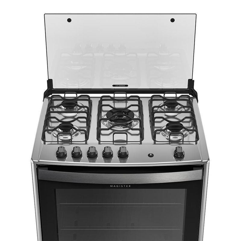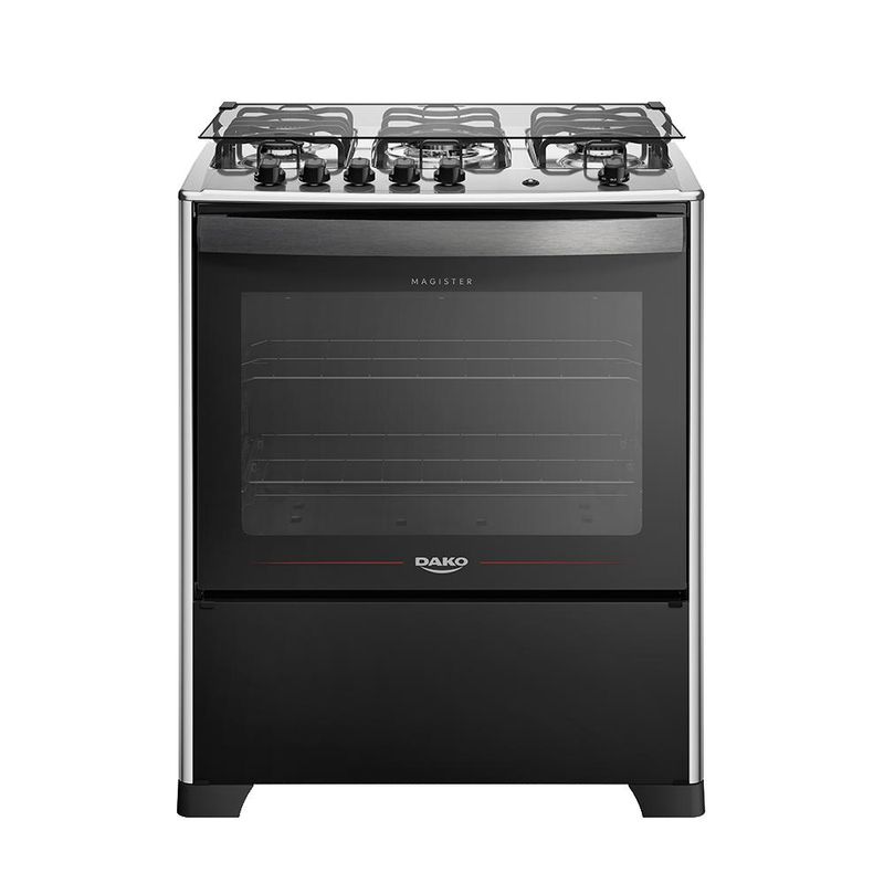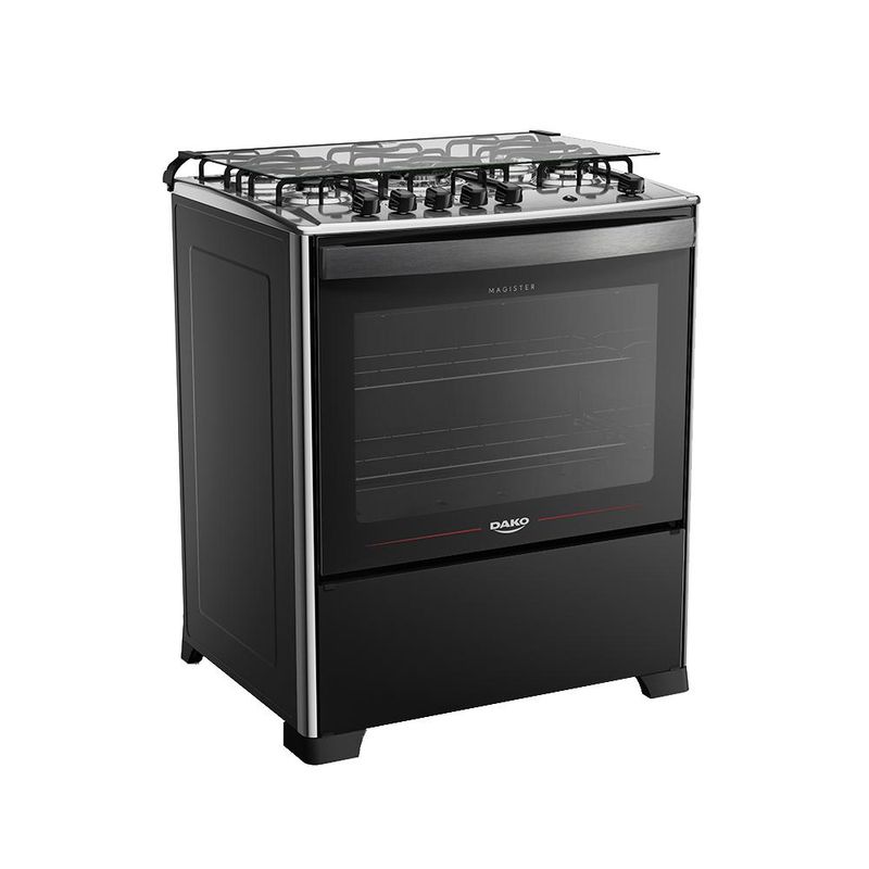 O Fogão 5 Bocas Preto com Mesa de Inox Dako Magister foi criado para os apaixonados por design e modernidade que querem um produto sofisticado e repleto de recursos. O design é um espetáculo à parte. Impecável e elegante, ele conta com uma porta toda em vidro, cantoneiras em inox e um puxador em alumínio escovado. Esses detalhes dão ao fogão um visual moderno e luxuoso, que chama a atenção de qualquer um. Além disso, é super econômico, pois conta com isolamento térmico! Confira as demais características do produto:. Ficha Técnica: Marca: DakoVoltagem: BivoltPadrão de tomada: 10ACor: PretoLinha: MagisterQuantidade de queimadores: 5 bocasAcendimento: AutomáticoGarantia: 12 mesesAcabamento da mesa: inoxInstalação: de pisoDimensões do produto: 76,0 x 96,0 x 63,3 cm (largura x altura x profundidade)Peso: 37,7 kgComprimento do cabo de energia: 96cmFuncionamento: GásCapacidade do forno: 100 litrosAcabamento do forno: Limpa FácilLuz no forno: Sim (lâmpada acompanha o produto)Vidro do forno: Vidro DuploTampa: SimTrempes (grades superiores): dupla de aço esmaltadoGrades do forno: 1 grade deslizante e 1 auto deslizanteBotões removíveis: simFabricação: NacionalPotência dos queimadores: 2 Bocas Semi-Rápido de 1,7kW, 2 Bocas Rápido de 2,0kW e 1Q Tripla Chama de 3,3kWSistema corta/bloqueia gás: SimEficiência Energética: A *Não vendemos para CNPJ nesse canal, por favor finalize sua compra com um CPF.
