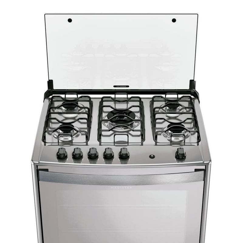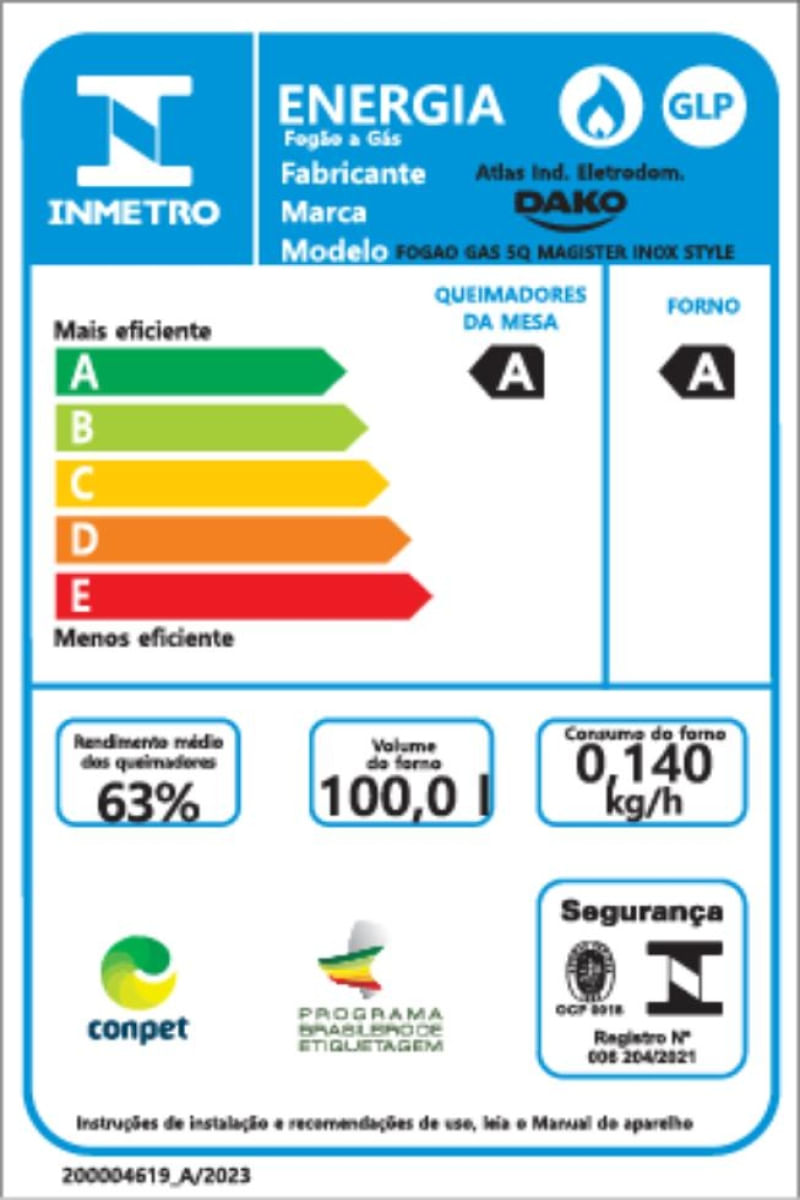 O Magister Inox Style foi criado para quem quer um produto sofisticado e repleto de recursos.Com a Tripla Chama e acendimento automático, forno de grande capacidade conta com duas prateleiras, sendo uma auto deslizante e outra deslizante, as grades duplas são de piatina. Atributos e benefíciosDesign que reflete seu estilo: frente totalmente espelhada com cantoneiras em inox e puxador de alumínio escovado, adicionando um toque de luxo e modernidade ao ambiente.Cozinha com estabilidade: grades duplas de piatina que garantem máxima firmeza e segurança ao movimentar as panelas.Potência na medida certa: versão 4 bocas com Mega Chama para preparos mais rápidos e versão 5 bocas com a potência da Tripla Chama, ideal para receitas maiores.Praticidade que inspira: duas prateleiras no forno, sendo uma autodeslizante para facilitar a retirada dos pratos e outra com altura ajustável para maior versatilidade.Mais controle no preparo: visor amplo e lâmpada interna que permitem acompanhar suas receitas sem abrir a porta do forno.Economia para o seu dia a dia: isolamento térmico com lã de basalto que preserva o calor, otimizando a temperatura e reduzindo o consumo de gás.Limpeza sem esforço: acabamento Limpa Fácil que simplifica a limpeza e a manutenção da sua cozinha. Ficha TecnicaMarca: DakoVoltagem: BivoltPadrão de tomada: 10ACor: EspelhadoLinha: Magister StyleQuantidade de queimadores: 5 bocasAcendimento: AutomáticoGarantia: 12 mesesAcabamento da mesa: inoxInstalação: de pisoDimensões do produto: 76,0 x 96,0 x 63,3 cm (largura x altura x profundidade)Peso: 37,7 kgComprimento do cabo de energia: 96cmFuncionamento: GásCapacidade do forno: 100 litrosAcabamento do forno: Limpa FácilLuz no forno: Sim Vidro do forno: Vidro DuploTampa: SimTrempes (grades superiores): Dupla de PiatinaGrades do forno: 1 grade deslizante e 1 auto deslizanteFabricação: NacionalPotência dos queimadores: 2Q Semi-Rápido de 1,7kW, 2Q Rápido de 2,0kW e 1Q Tripla Chama de 3,3kWSistema corta/bloqueia gás: SimEficiência Energética: A ** Atenção nas compras com CNPJ:Para que o pedido seja processado corretamente, é obrigatório informar no momento da compra:- Se o CNPJ é Contribuinte: deve-se indicar se o cliente é Isento ou possui Inscrição Estadual (IE).Se o CNPJ é Não Contribuinte: essa condição também deve ser informada. "Ex.: Isento"- Pedidos sem essas informações serão automaticamente cancelados.- Não aceitamos atualizações via chat.