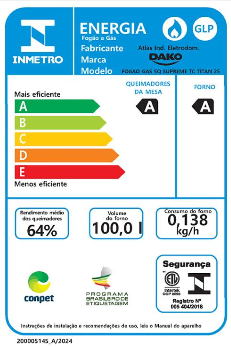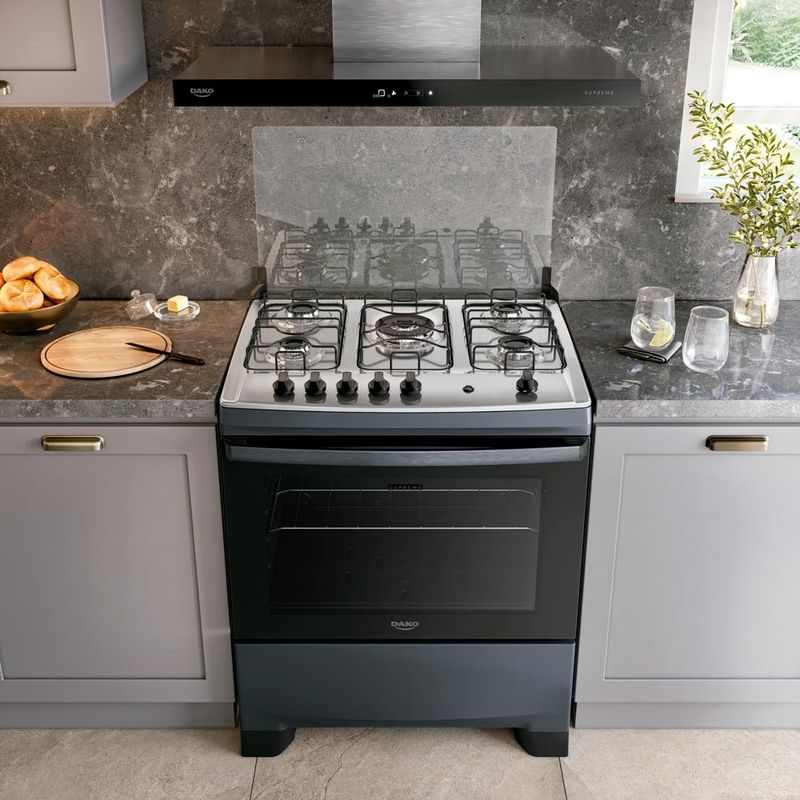 Os tempos mudaram, e o Supreme Inox também, mas ele continua compacto por fora e gigante por dentro. Afinal, até os sucessos merecem ser reinventados.Tenha mais agilidade no preparo das refeições com a praticidade que você merece. Moderno, seguro e eficiente, o fogão Dako Supreme Inox é ideal para todos os estilos de cozinha.A versão 5 bocas possui Tripla Chama que oferece mais agilidade no preparo, enquanto as grades duplas de aço oferecem firmeza e estabilidade para suas panelas. O puxador em alumínio escovado, além de ergonômico, dá um toque de sofisticação no design. A prateleira deslizante torna ainda mais fácil colocar e retirar suas receitas com total praticidade. O visor amplo do forno permite acompanhar o preparo sem precisar abrir a porta, e o acabamento Limpa Fácil deixa a limpeza ainda mais rápida e descomplicada. Ter um Fogão Dako Supreme Inox é transformar a cozinha no coração da sua casa. É sentir o prazer de preparar refeições deliciosas com a confiança de estar utilizando um fogão que alia qualidade e inovação.Poucas coisas funcionam tão bem quanto um Fogão Dako Supreme Inox.Você vai perceber: Na hora de comprar, a Dako surpreende!Ficha Técnica:Voltagem: BivoltPadrão de Tomada: 10ACor: TitaniumLinha: SupremeQuantidade de Bocas: 5 bocasTipo de Acendimento: AutomáticoGarantia: 12 MesesAcabamento da Mesa: InoxInstalação: Fogão de PisoTurbo Convecção: NãoDimensões do Produto (largura x altura x profundidade): 77,3 x 96,0 x 64,7 cmComprimento do Cabo de Energia: 96 cmFuncionamento: GásCapacidade do Forno: 100 LitrosAcabamento do Forno: Limpa FácilLuz no Forno: Sim (lâmpada de 220v acompanha o produto)Vidro do Forno: Vidro DuploTampa: Sim Trempes: Grades duplas de açoGrades do Forno: 1 Grade deslizanteTimer Digital: NãoBotões Removíveis: SimFabricação: NacionalPotência dos Queimadores: 1Q Tripla Chama de 3,3 kW, 2Q Família de 2,0kW e 2Q Semi-Rápido de 1,7kWSistema Corta/Bloqueia Gás: SimEficiência Energética: AEAN: 7897180599249Conversão de Gás: Gratuita, se solicitada em até 90 dias após o recebimento do produtoServiço de Instalação: Não realizamos. Consulte nosso SAC para indicações de assistência técnica credenciada na sua região