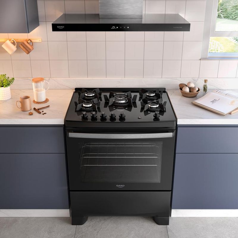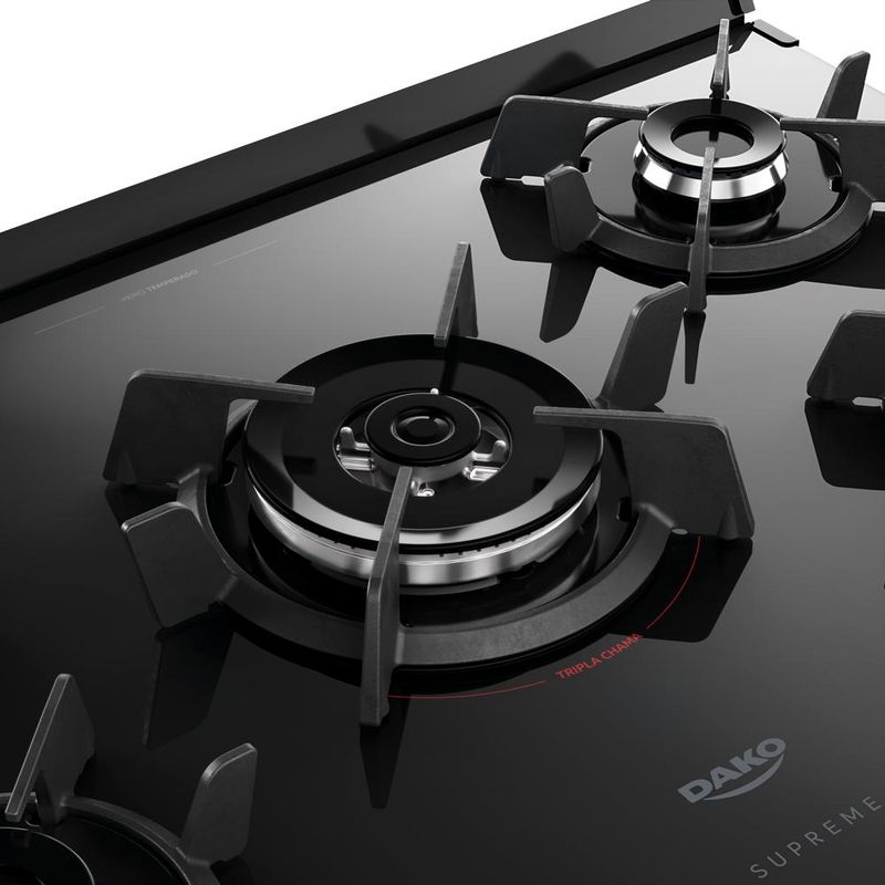 Os tempos mudaram e o Supreme Glass também. Ele continua compacto por fora e gigante por dentro. Afinal, até os sucessos merecem ser reinventados.Tenha mais agilidade no preparo das refeições com a praticidade que você merece. Moderno, seguro e eficiente, o fogão Dako Supreme Glass é perfeito para todos os estilos de cozinha. A versão de 5 bocas conta com **Tripla Chama** para um preparo rápido, enquanto as **grades individuais de ferro fundido**, com 6 pontos de apoio, garantem aderência e estabilidade para suas panelas.O **puxador em alumínio escovado**, além de ergonômico, dá um toque a mais de sofisticação no design. A **prateleira deslizante** torna ainda mais fácil colocar e retirar suas receitas com total praticidade. O **visor amplo** do forno permite acompanhar o preparo sem precisar abrir a porta, e o acabamento **Limpa Fácil** deixa a limpeza ainda mais rápida e descomplicada.Ter um Fogão Dako Supreme Glass é transformar a cozinha no coração da sua casa. É sentir o prazer de preparar refeições deliciosas com a confiança de estar utilizando um fogão que alia qualidade e inovação.Poucas coisas funcionam tão bem quanto um Fogão Dako Supreme Glass.Você vai perceber: na hora de comprar, a Dako surpreende!Confira demais características do produto: Voltagem: BivoltPadrão de Tomada: 10ACor: PretoLinha: Supreme GlassQuantidade de Bocas: 5 bocasTipo de Acendimento: AutomáticoGarantia: 12 MesesAcabamento da Mesa: Vidro TemperadoInstalação: Fogão de PisoTurbo Convecção: NãoDimensões do Produto (largura x altura x profundidade): 76,6 x 95,0 x 65,2 cmComprimento do Cabo de Energia: 96 cmFuncionamento: GásCapacidade do Forno: 100 LitrosAcabamento do Forno: Limpa FácilLuz no Forno: Sim (lâmpada de 220v acompanha o produto)Vidro do Forno: Vidro DuploTampa: NãoTrempes: Ferro fundidoGrades do Forno: 2 Grades deslizantesTimer Digital: NãoBotões Removíveis: SimFabricação: NacionalPotência dos Queimadores: 2Q Semirrápido de 1,7 kW e 2Q Rápido de 2,0kWSistema Corta/Bloqueia Gás: SimEficiência Energética: AEAN: 7897180599171