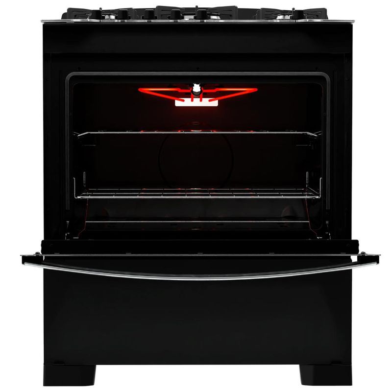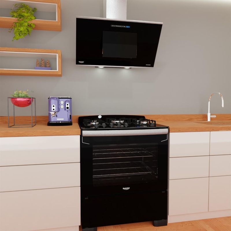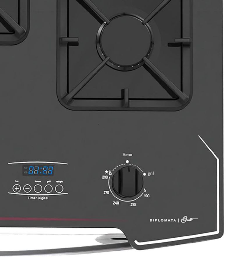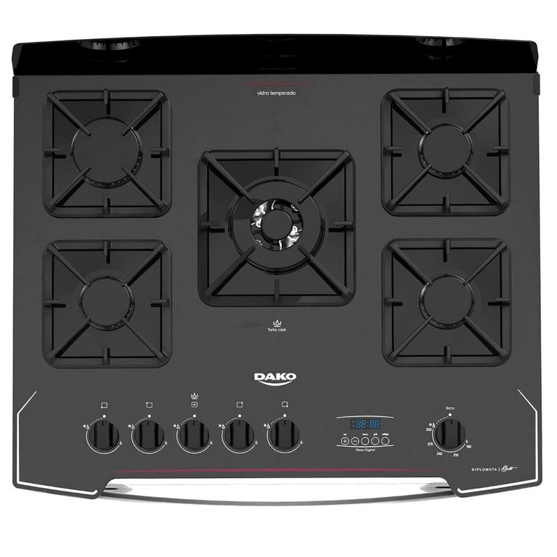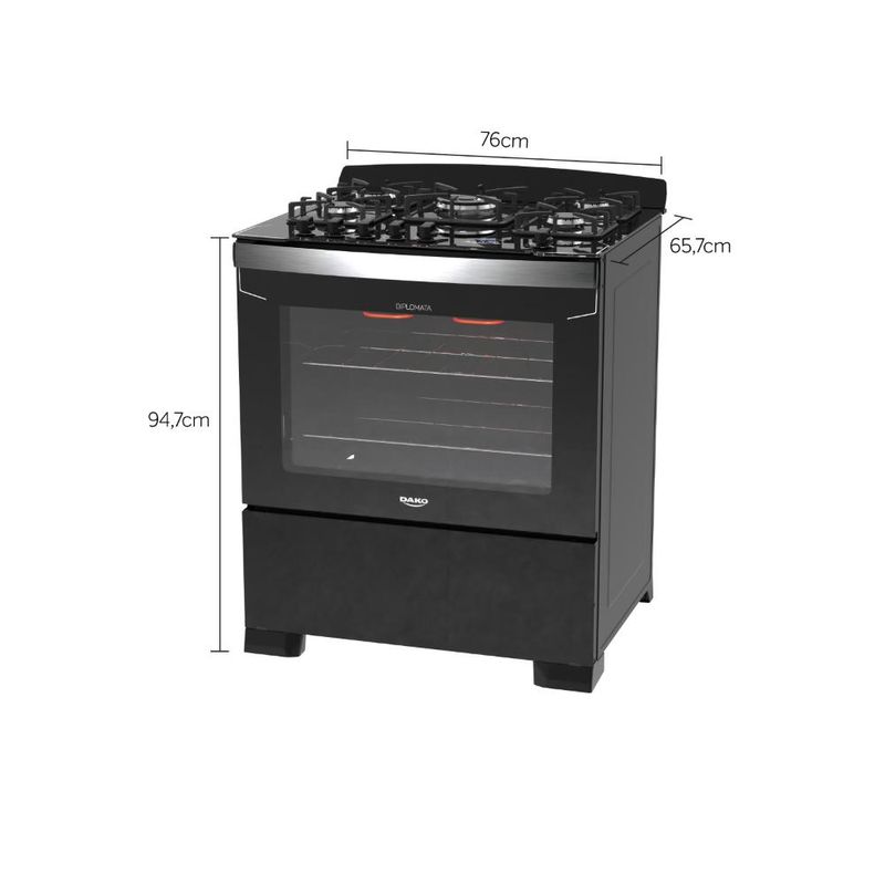 Com frente total em vidro preto, o fogão Dako Diplomata 5 Bocas traz modernidade e praticidade à sua cozinha. Ele conta com timer digital, testeira anti-resíduos removível em vidro temperado e mesa de vidro temperado com recorte frontal. Possui grades de ferro fundido quadradas com 8 pontos de apoio, puxador de alumínio escovado, pés robustos, botões ergonômicos e trava de segurança infantil. Com 3 queimadores semirrápidos de 1,7kW, 1 queimador rápido de 3,0kW e 1 queimador extrarrápido tripla chama de 3,3kW, oferece chama ideal para qualquer receita. O forno tem capacidade de 100 litros, grill e dourador elétrico, acabamento limpa fácil, 1 grade autodeslizante e 1 deslizante, além de porta com vidro duplo que preserva o calor. Ficha Técnica: Voltagem: BivoltCor: PretoQuantidade de Bocas: 5 bocasTipo de Acendimento: SuperautomáticoGarantia: 12 MesesAcabamento da Mesa: Vidro TemperadoInstalação: Fogão de PisoDimensões do Produto (largura x altura x profundidade): 76 x 94,7 x 65,7 cmGrill: SimFuncionamento: GásCapacidade do Forno: 100 LitrosAcabamento do Forno: Limpa FácilLuz no Forno: Sim (lâmpada acompanha o produto)Vidro do Forno: Vidro DuploTampa: NãoTrempes: Ferro fundido com 8 pontos de apoioGrades do Forno: 1 Grade autodeslizante e 1 deslizanteTimer Digital: SimBotões Removíveis: SimFabricação: NacionalPotência dos Queimadores: 3Q Semirrápidos de 1,7kW, 1Q Rápido de 3,0kW e 1Q Extrarrápido Tripla Chama de 3,3kWSistema Corta/Bloqueia Gás: SimEficiência Energética: A*Não faturamos para CNPJ, apenas CPF.