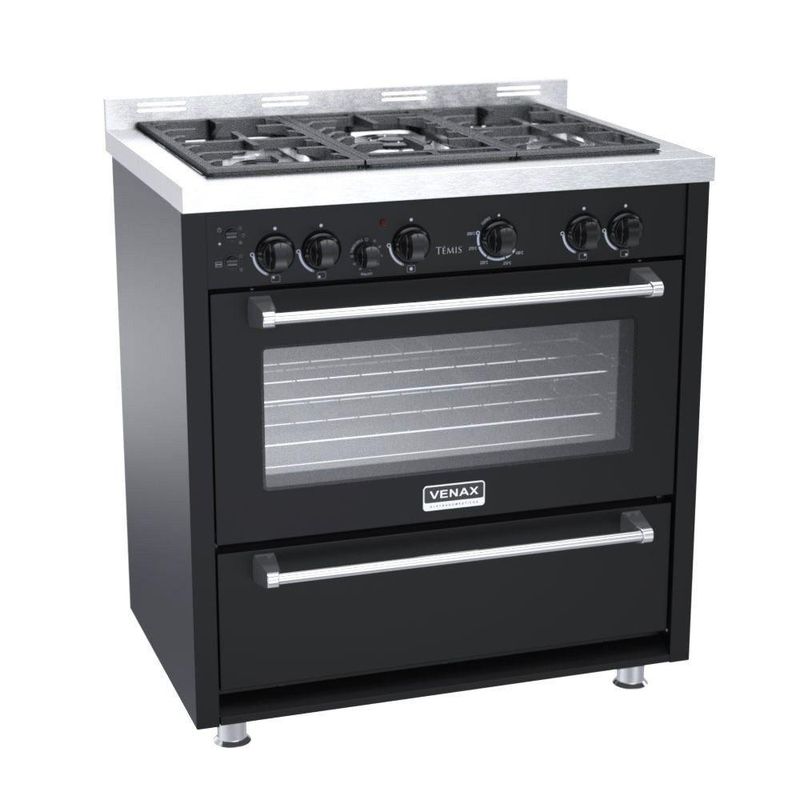 Fogão 5 Bocas Venax Temis A Gás Mesa De Inox 127V PretoO Fogão a Gás Venax Temis combina sofisticação, praticidade e eficiência, com acendimento automático e queimadores de alta performance. Ideal para quem busca qualidade e design moderno para a cozinha, ele oferece recursos inovadores para facilitar o seu dia a dia na preparação de alimentos.Principais Características:Acendimento Automático: Maior praticidade e segurança na hora de acender os queimadores.Queimadores de Alta Performance:1 Queimador Tripla Chama (3,0 kW)1 Queimador Grande (1,8 kW)3 Queimadores Médios (1,35 kW cada)Mesa de Queimadores: Fabricada em Aço Inox 304 Escovado, garantindo durabilidade e facilidade de limpeza.Trempe Dupla em Ferro Fundido Esmaltada: Mais robustez e resistência ao calor.Forno de 88,3L: Espaçoso, ideal para grandes preparos e receitas variadas.Luz no Forno: Proporciona melhor visibilidade enquanto você cozinha.Prateleiras Auto Deslizantes no Forno: Duas prateleiras que facilitam a movimentação das assadeiras.Revestimento do Forno: Esmalte Easy Clean, que facilita a limpeza e manutenção.Função Grill: Ideal para grelhar carnes e outros alimentos de forma eficiente.Espeto Giratório: 2 espeto removíveis para um preparo mais uniforme dos alimentos.Temperatura do Forno: 5 posições, variando de 180°C até 290°C, permitindo o ajuste ideal para cada tipo de prato.Timer Grill: Para controle de tempo durante o uso do grill.Válvula de Segurança: Sistema de segurança para maior tranquilidade no uso do fogão.Porta Removível e Vidro Duplo: Para facilitar a limpeza e garantir a segurança térmica.Puxador de Porta e Estufa: Aço Cromado, proporcionando resistência e durabilidade.Bandeja Coletora de Resíduos: Facilita a limpeza após o uso.Entrada de Gás: Uma entrada localizada no lado esquerdo (vista de frente).Especificações Técnicas:Marca: VenaxModelo: TemisRef.: 9252Voltagem: 127VFrequência: 60HzClassificação Energética: ATipo: Fogão de PisoAlimentação: Gás GLP (conversão para Gás Natural não coberta pela )Etiquetas: ENCE e CONPETPotência do Grill: 1250WPotência do Queimador do Forno: 3,30 kWPotência dos Queimadores da Mesa: Tripla Chama 3,0 kWQueimador Grande: 1,8 kWQueimadores Médios: 1,35 kW (cada)Dimensões Internas do Forno (LxAxP): 64,8 cm x 29 cm x 47 cmDimensões do Produto (LxAxP): 82 cm x 94 cm x 65 cmPeso: 50 kg do Produto: 12 meses contra defeitos de fabricação, conforme as normas do fabricante.DImportante: Conferência na : É imprescindível verificar o produto no momento da . Caso haja anormalidades, recuse o recebimento.Imagens: As imagens são meramente ilustrativas e podem sofrer variações devido à resolução do monitor, iluminação ou percepção visual. Objetos decorativos não acompanham o produto.Todas as informações divulgadas são de responsabilidade do fabricante e podem ser alteradas sem aviso prévio.