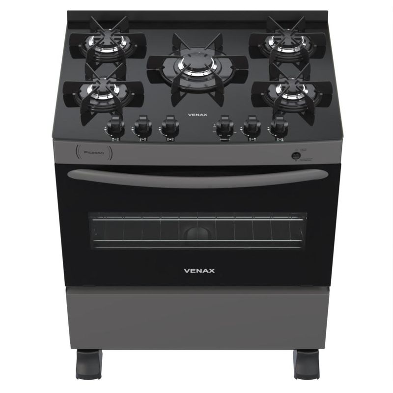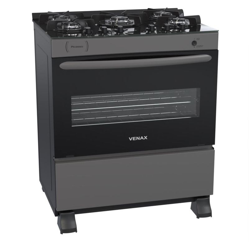 CaracterísticasTipo: Fogão de pisoMarca: VenaxAcendimento: AutomáticoQueimadores: 3 Grandes e 2 médiosTrempe dos queimadores: Individual esmaltadaMesa dos queimadores: VidroTampa de vidro: NãoBotões: RemovíveisPrateleiras no forno: 2 DeslizantesRevestimento forno: Esmalte limpa fácilTemperatura: 5 Posições de 180°C até 290°CVálvula de segurança: SimLuz no forno: Sim (lâmpada não acompanha o produto)Função grill: NãoTimer grill: NãoTimer gás: NãoEspeto giratório: NãoBandeja coletora de resíduos: NãoPorta do forno removível: SimPorta do forno: Vidro panorâmicoVidro duplo na porta: SimPuxador da porta: Aço pintadoEstufa: NãoCor das laterais: PretoEntrada de gás: Uma entrada, lado esquerdo visto de frenteMedidas do produto: Altura 88cm - Largura 75cm - Profundidade 61cmEspecificações TécnicasAlimentação: Gás GLP (A conversão para Gás Natural não é coberta pela garantia)Tensão: BivoltFrequência: 50/60HzPotência queimador: 1,80kW (queimador grande); 1,35kW (queimador médio)Dimensões internas do forno(LxPxA): 648x470x290 (mm)Volume do forno: 88,3LPotência queimador do forno: 3,30kWClassificação energética: "A"Etiquetas: ENCE e CONPETGarantia: 1 AnoL-largura / P-profundidade / A-altura