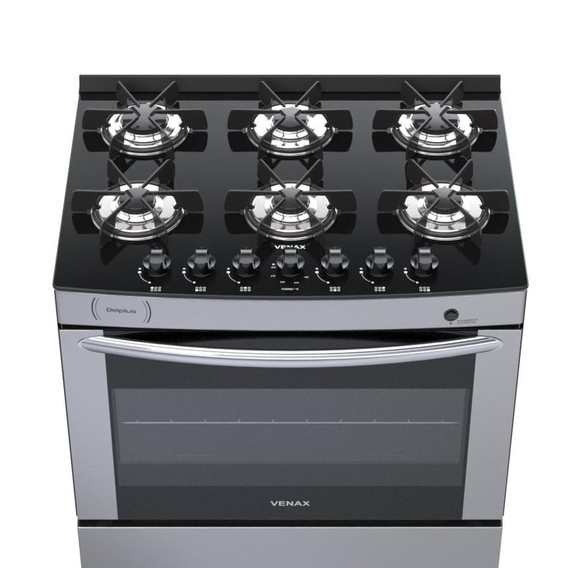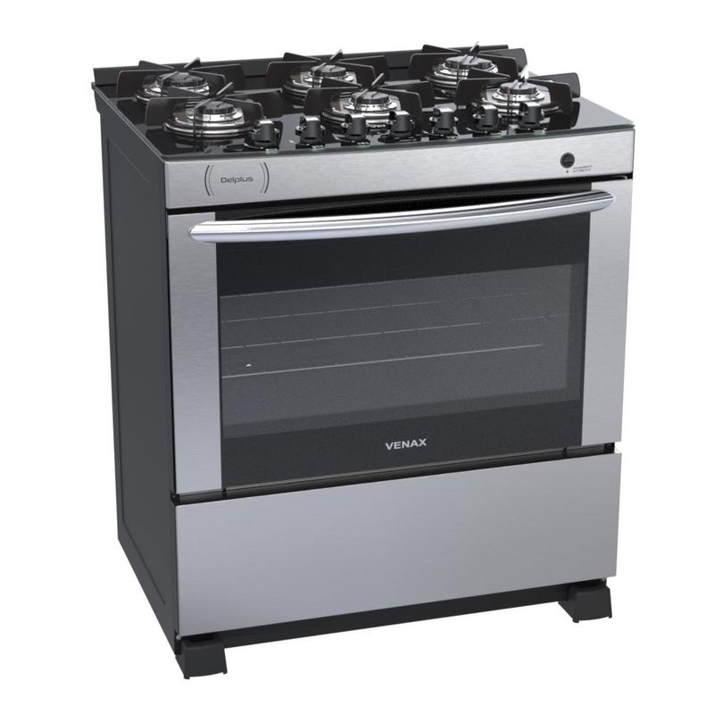 CaracterísticasTipo: Fogão de pisoMarca: VenaxAcendimento: AutomáticoQueimadores: 2 Grandes e 4 MédiosTrempe dos queimadores: Individual esmaltadaMesa dos queimadores: VidroBotões: RemovíveisPrateleiras no forno: 1 regulávelRevestimento forno: Esmalte limpa fácilTemperatura: 5 Posições de 180°C até 290°CVálvula de segurança no forno: SimLuz no forno: NãoFunção grill: NãoTimer grill: NãoTimer gás: NãoEspeto giratório: NãoBandeja coletora de resíduos: NãoPorta removível: SimPorta do forno: Vidro com base lateralVidro duplo na porta: SimPuxador da porta: CromadoEstufa: NãoCor das laterais: PretoEntrada de gás: Uma entrada, lado esquerdo visto de frenteMedidas do produto: Altura 88cm - Largura 75cm - Profundidade 61cmEspecificações TécnicasAlimentação: Gás GLP (A conversão para Gás Natural não é coberta pela garantia)Tensão: BivoltFrequência: 50/60HzPotência queimadores da mesa: 1,80kW (queimador grande); 1,35kW (queimador médio)Dimensões internas do forno(LxPxA): 648x470x290 (mm)Volume do forno: 88,3LPotência queimador do forno: 3,30kWClassificação energética: "A"Etiquetas: ENCE e CONPETGarantia: 1 AnoL-largura / P-profundidade / A-altura