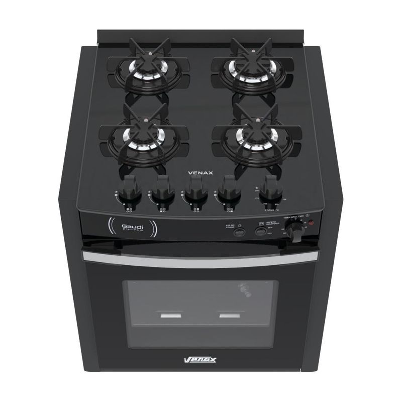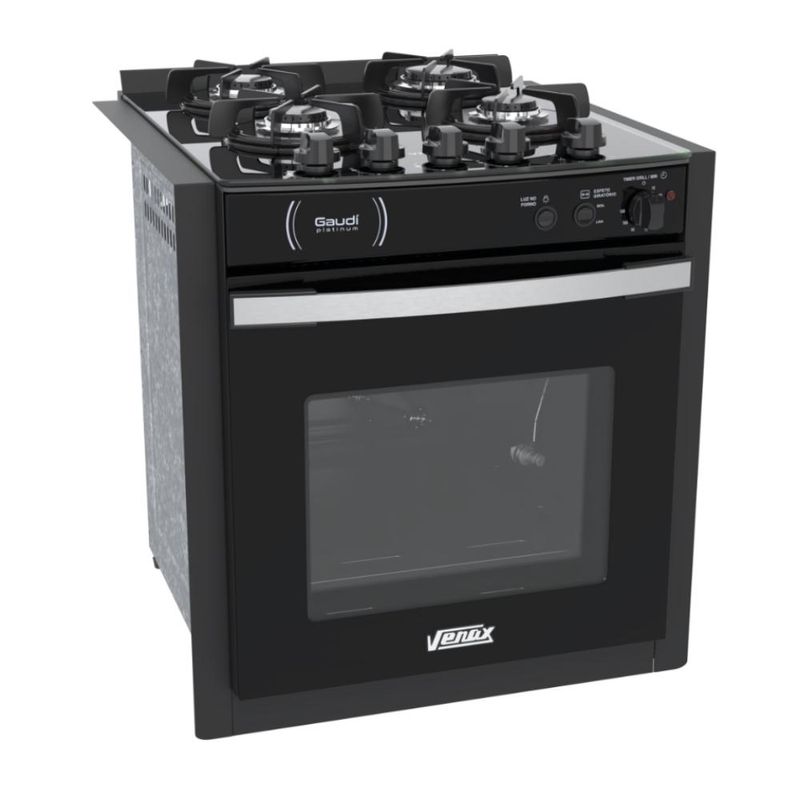CaracterísticasTipo: Fogão de embutirMarca: VenaxAcendimento: AutomáticoQueimadores: 1 Grande e 3 MédiosTrempe dos queimadores: Individual luxo esmaltadaMesa dos queimadores: VidroTampa de vidro: NãoBotões: RemovíveisPrateleiras no forno: 2 Auto deslizantesRevestimento forno: Esmalte limpa fácilTemperatura: 5 Posições de 180°C até 290°CVálvula de segurança: SimLuz no forno: Sim (lâmpada não acompanha o produto)Função grill: SimTimer grill: SimTimer gás: NãoEspeto giratório: 1 Espeto removívelBandeja coletora de resíduos: SimPorta removível: SimPorta do forno: Visor de vidroVidro duplo na porta: SimPuxador da porta: AlumínioEntrada de gás: Uma entrada, lado esquerdo visto de frenteMedidas do produto: Altura 62cm - Largura 55,5cm - Profundidade 62cmEspecificações TécnicasAlimentação: Gás GLP (A conversão para Gás Natural não é coberta pela garantia)Tensão: 127V ou 220V (não é bivolt, selecione no momento da compra)Frequência: 60HzPotência queimadores da mesa: 1,80kW (queimador grande); 1,35kW (queimador médio)Dimensões internas do forno(LxPxA): 378x470x290 (mm)Volume do forno: 51,8LPotência queimador do forno: 2,30kWPotência do grill: 700WClassificação energética: "A"Etiquetas: ENCE e CONPETGarantia: 1 AnoL-largura / P-profundidade / A-altura
