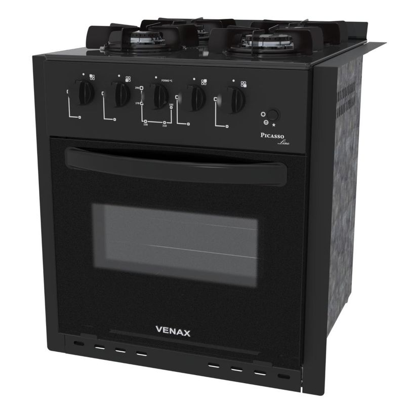 CaracterísticasTipo: Fogão de embutirMarca: VenaxAcendimento: AutomáticoQueimadores: 1 Grande e 3 MédiosTrempe dos queimadores: Individual esmaltadaMesa dos queimadores: VidroTampa de vidro: NãoBotões: RemovíveisPrateleiras no forno: 1 RegulávelRevestimento forno: Esmalte limpa fácilTemperatura: 5 Posições de 180°C até 290°CVálvula de segurança: SimLuz no forno: NãoFunção grill: NãoTimer grill: NãoTimer gás: NãoEspeto giratório: NãoBandeja coletora de resíduos: NãoPorta removível: NãoPorta do forno: Vidro panorâmicoVidro duplo na porta: SimPuxador da porta: Aço pintadoEntrada de gás: Uma entrada, lado esquerdo visto de frenteMedidas do produto: Altura 63cm - Largura 55,5cm - Profundidade 61cmEspecificações TécnicasAlimentação: Gás GLP (A conversão para Gás Natural não é coberta pela garantia)Tensão: BivoltFrequência: 50/60HzPotência queimadores da mesa: 1,80kW (queimador grande); 1,35kW (queimador médio)Dimensões internas do forno(LxPxA): 378x470x290 (mm)Volume do forno: 51,8LPotência queimador do forno: 2,30kWClassificação energética: "A"Etiquetas: ENCE e CONPETGarantia: 1 AnoL-largura / P-profundidade / A-altura