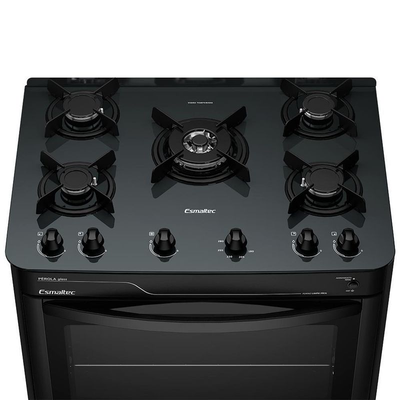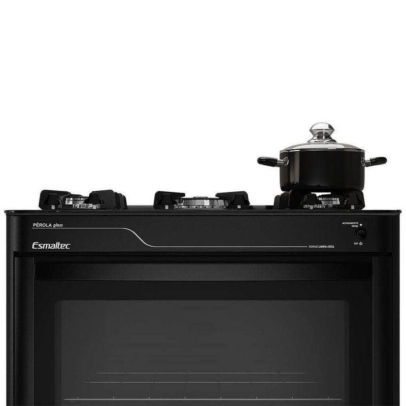 Fogão A Gás Mesa De Vidro Limpa Fácil E Acendimento Automático Esmaltec Pérola Glass 5 Bocas PretoO Fogão Esmaltec Pérola Glass 5 bocas preto é ideal para quem precisa de mais potência, espaço e praticidade na cozinha.Mesa em vidro temperado: qualidade, resistência e fácil limpezaQueimador Tripla Chama: mais potência e agilidade no preparoTrempes de aço: firmeza e para todos os tipos de panelaAcendimento automático: praticidade no uso diárioForno com acabamento Limpa Fácil esmaltado (95L): limpeza simples e eficiente1 prateleira ajustável: flexibilidade para diferentes receitasPorta do forno com visor amplo: melhor visualização do preparoSua mesa em vidro temperado é resistente, fácil de limpar e valoriza o ambiente com um visual moderno.O modelo conta com queimador Tripla Chama, que acelera o preparo dos alimentos ao distribuir o calor de forma mais eficiente. As trempes de aço garantem firmeza no uso, enquanto o acendimento automático facilita o dia a dia.O forno tem capacidade de 95 litros, acabamento Limpa Fácil esmaltado e 1 prateleira ajustável, o que torna o preparo mais versátil e a limpeza muito mais prática.A porta com visor amplo oferece maior controle visual durante o fogão completo, feito para quem leva a cozinha a sério.Isso é valor.Isso é Esmaltec.Quantidade de Bocas: 5 | Produto: Fogão | Alimentação: A gás | Mesa: Vidro | Acendimento automático: Sim | Cor: Preto | Tipo: De piso | Voltagem: Bivolt