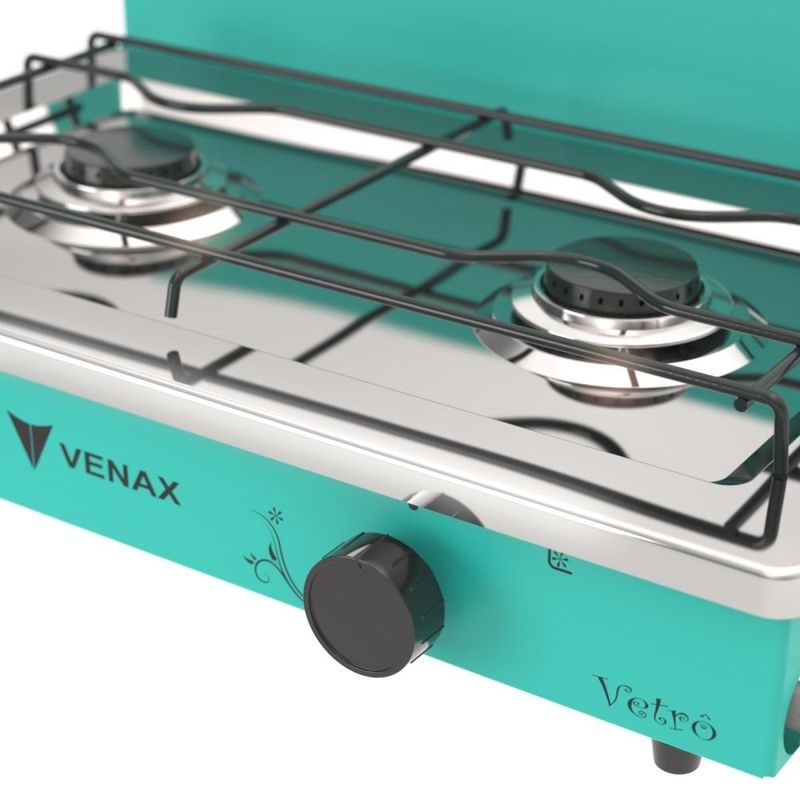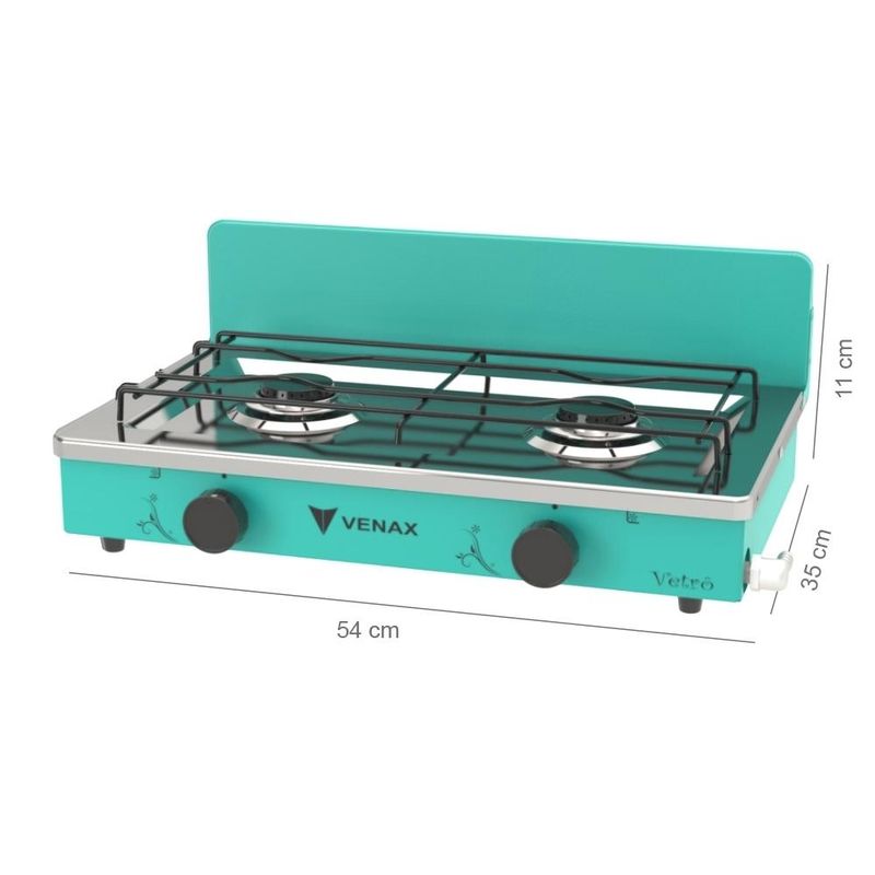 CaracterísticasTipo: Fogão portátilMarca: VenaxAcendimento: ManualQueimadores: 2 MédiosTrempe dos queimadores: EsmaltadasMesa dos queimadores: InoxTampa da mesa: RespaldoBotões: RemovíveisEntrada de gás: Uma entrada, lado direito visto de frenteMedidas do produto: Altura 11cm - Largura 54cm - Profundidade 35cmEspecificações TécnicasAlimentação: Gás GLP (A conversão para Gás Natural não é coberta pela garantia)Potência queimador: 1,35kW (queimador médio)Classificação energética: IsentoEtiquetas: IsentoGarantia: 1 Ano