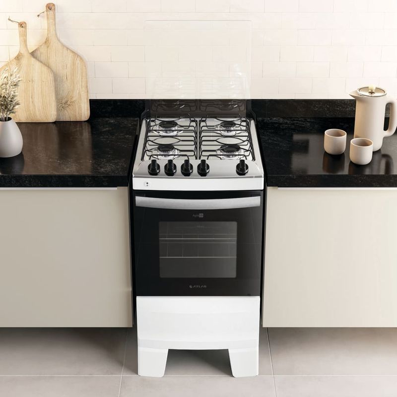 Fogão Atlas 4 Bocas Agile Up com Mesa de Inox, Grade Dupla no Forno e Acendimento automático Bivolt - Branco