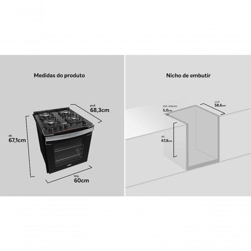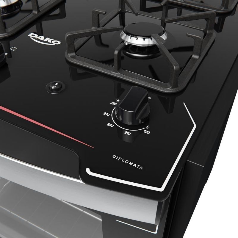 Fogão De Embutir 4 Bocas Preto Com Mesa De Vidro Dako Diplomata Bivolt O Fogão de Embutir 4 Bocas Preto com Mesa de Vidro Dako Diplomata Bivolt conta com 3 queimadores semi rápidos de 1,7kW, 1 queimador rápido de 3,0kW, forno com excelente capacidade de 82,5 litros e dimensões internas 37 x 36 x 45 cm (largura x altura x profundidade). Voltagem: BivoltCor: PretoLinha: DiplomataQuantidade de Bocas: 4 bocasTipo de Acendimento: AutomáticoGarantia: 12 MesesAcabamento da Mesa: Vidro TemperadoInstalação: Fogão de EmbutirTurbo Convecção: NãoDimensões do Produto (largura x altura x profundidade): 60 x 67,1 x 68,3 cmDimensões Internas do Forno (largura x altura x profundidade): 37 x 36 x 45 cmDimensões do Nicho (largura x altura x profundidade): 57 x 59,8 x 58,6 cmGrill: NãoFuncionamento: GásCapacidade do Forno: 82,5 LitrosAcabamento do Forno: Limpa FácilLuz no Forno: Sim (lâmpada acompanha o produto)Vidro do Forno: Vidro DuploTampa: NãoTrempes: Individual de ferro fundido com 8 pontos de apoioGrades do Forno: 1 Grade autodeslizante e 1 deslizanteTimer Digital: NãoBotões Removíveis: SimFabricação: NacionalPotência dos Queimadores: 3Q Ramal de 1,7kW e 1Q Ramal de 3,0kWSistema Corta/Bloqueia Gás: SimEficiência Energética: A Conversão de Gás , se solicitada em até 90 dias após o recebimento do produtoNão realizamos serviço de instalação. Consulte nosso SAC para indicações de assistência técnica credenciada na sua regiãoNão faturamos para CNPJ nesse canal, conclua sua compra através de um CPF.Voltagem: Bivolt | Cor: Preto | Quantidade de Bocas: 4 | Acendimento: Automático | Mesa: Vidro Temperado | Instalação: De Embutir | Largura: 60 cm | Altura: 67,10 cm | Profundidade: 68,30 cm | Dimensões Internas do Forno (largura x altura x profundidade): 37 x 36 x 45 cm | Dimensões do Nicho (largura x altura x profundidade): 57 x 59,8 x 58,6 cm | Funcionamento: Gás | Capacidade do Forno: 82,50 Litros | Acabamento do Forno: Limpa Fácil | Luz no Forno: Sim (lâmpada acompanha o produto) | Vidro do Forno: Vidro Duplo | Tampa: Não | Trempes: Individuais de ferro fundido com 8 pontos de apoio | Grades do Forno: 1 Grade autodeslizante e 1 deslizante | Botões Removíveis: Sim | Potência dos Queimadores: 3Q Ramal de 1,7kW e 1Q Ramal de 3,0kW | Sistema Corta/Bloqueia Gás: Sim | Eficiência Energética: A | RBN: 1