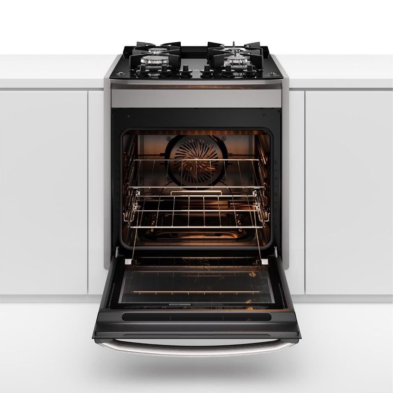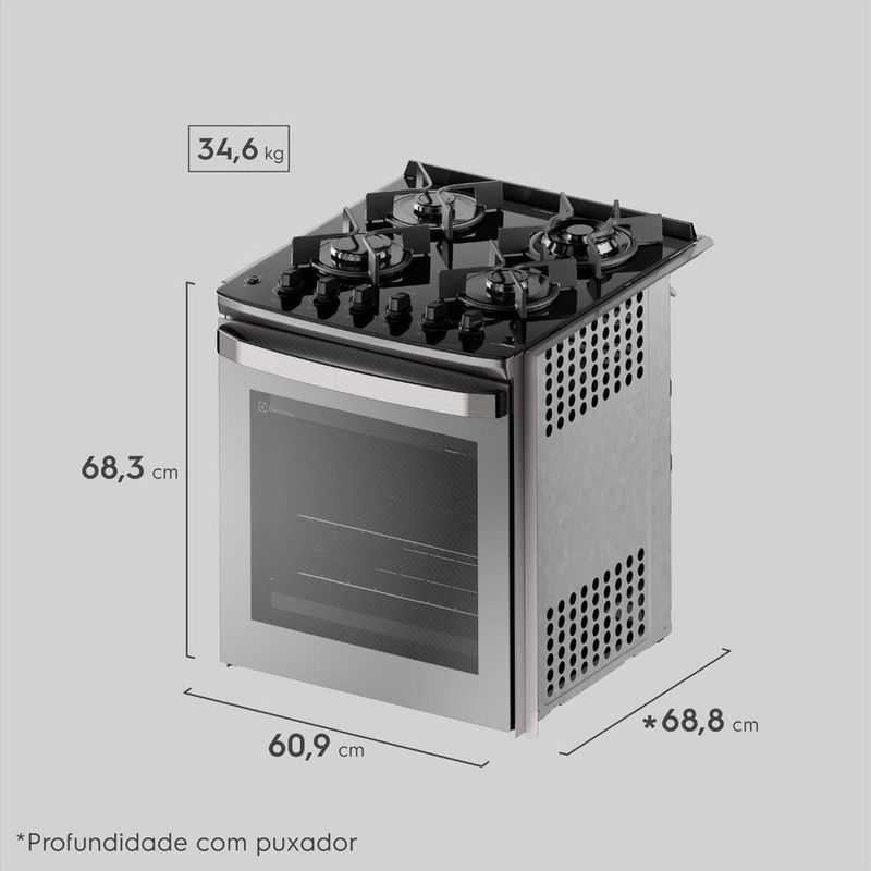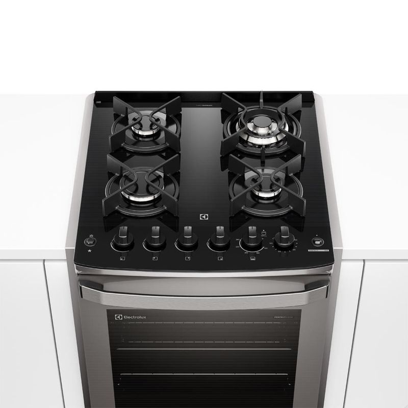 Fogão de Embutir Electrolux Experience FE4EG Cinza, a cozinha dos sonhos com um fogão perfeito! O Fogão de Embutir Electrolux 4 Bocas FE4EG Cinza da linha Experience combina elegância e alta performance para sua cozinha planejada. Equipado com Mesa de Vidro Temperado e Grades Individuais de Ferro Fundido, oferece design moderno, estabilidade e durabilidade no uso diário. Tecnologia PerfectCook360 A exclusiva Tecnologia PerfectCook360 une Cavidade Selada e Convecção, retendo a temperatura e circulando o ar quente uniformemente, permitindo assar até 33% mais rápido e por igual. VaporBake® Com a função VaporBake®, suas massas e pães ficam até 2 vezes mais crocantes, com melhor textura e sabor. Já o Regenerar a Vapor reaquece os alimentos recuperando aroma e frescor, sem ressecar. Capacidade do Forno O forno de 79,2 litros conta com Grill para gratinar e dourar, Timer Analógico com aviso sonoro e acabamento interno FastClean, que evita acúmulo de gordura e facilita a limpeza. Multi Chama ideal para panelas maiores Porta inteira em vidro para melhor visualização Vidro interno removível 1 prateleira manual + 1 autodeslizante Acendimento automático rápido e seguro Descubra mais produtos Electrolux e complete a sua cozinha!