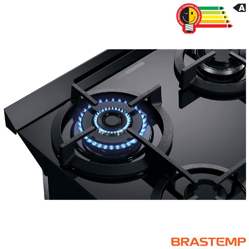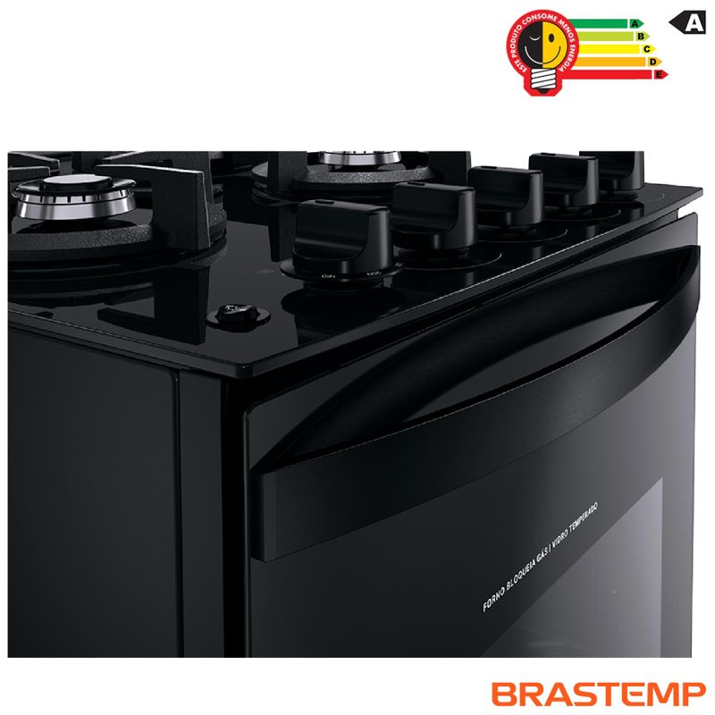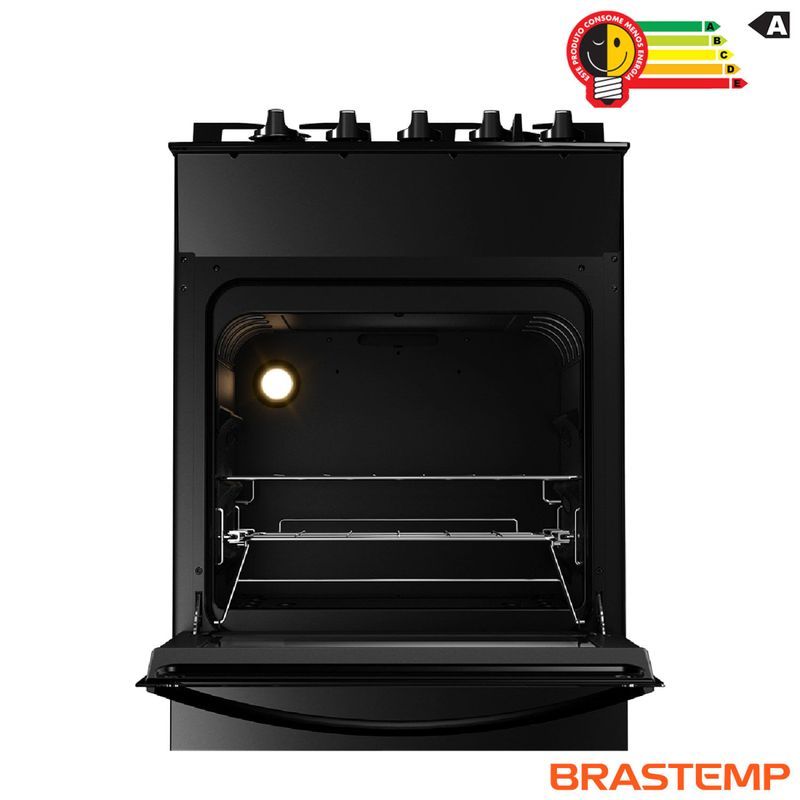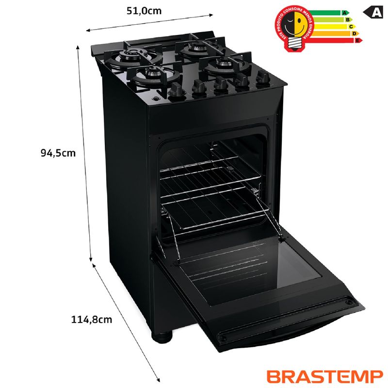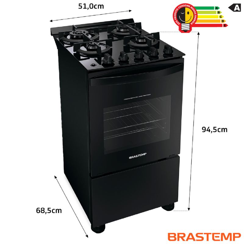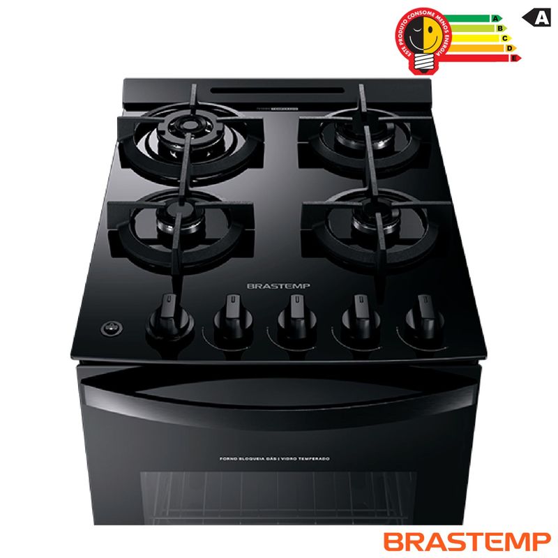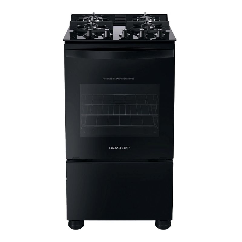 Com Acendimento Automático e 61 Litros de CapacidadeO Fogão Brastemp Mesa de Vidro 4 Bocas preto traz elegância e sofisticação para sua cozinha. Sua dupla chama e grades duplas de ferro fundido garantem robustez, potência e velocidade no preparo das suas receitas.CaracterísticasTipo: PisoQuantidade de Bocas: 04Quantidade de Fornos: 01Capacidade dos Fornos: 61 LitrosTipo de Acendimento: AutomáticoTipo de Queimadores: Queimador Semi-RápidoTipo de Grade no Forno: 02 com Alturas AjustáveisPainel: MecânicoLuz no FornoLâmpada Inclusa: Sim Botões Removíveis Trempe: Grades Duplas de Ferro FundidoMesa de Vidro TemperadoPrateleira inferior auto deslizante que facilita a retirada dos alimentos e prateleira superior com altura ajustávelEspecificações TécnicasModelo: BFO4XAEUNAFuncionamento: a GásSelo Procel (Eficiência Energética): ACor: PretoVoltagem: BivoltEAN: 7891129541023Garantia: 12 mesesDimensões e PesoDimensões do produto sem embalagem (AxLxP): 970x510x690 mmDimensões do produto com embalagem (AxLxP): 970x510x690 mmPeso do produto: 34,0 KgInstalação do ProdutoA transformação de gás do produto é gratuita dentro de 365 dias após a compra do produto (exceto acessórios para instalação como mangueira, registro, niple)Itens Inclusos01 Fogão01 Manual de InstruçõesImportanteO seu produto é bivolt (com exceção dos modelos com grill) porém, sai da fábrica para funcionar em 127 V. Caso sua residência seja 220 V, antes de ligar o produto na tomada, substitua a lâmpada 127 V por uma 220 V, que pode ser comprada nas Redes de Serviços Brastemp.Utilize sempre lâmpadas halógenas G9 de 25 W.
