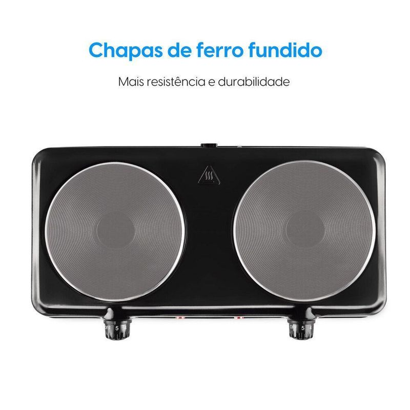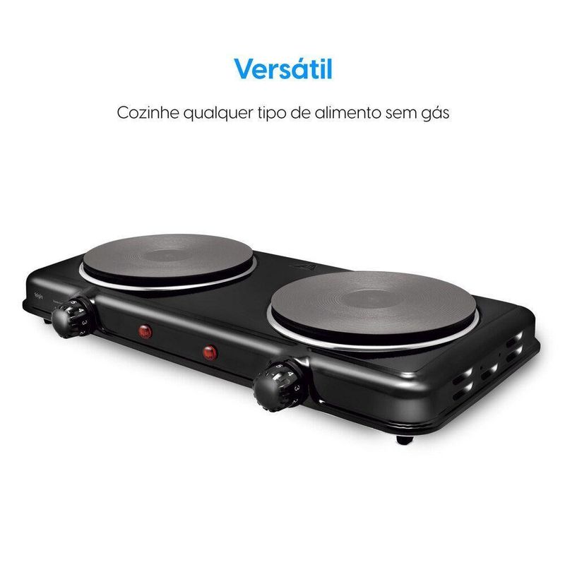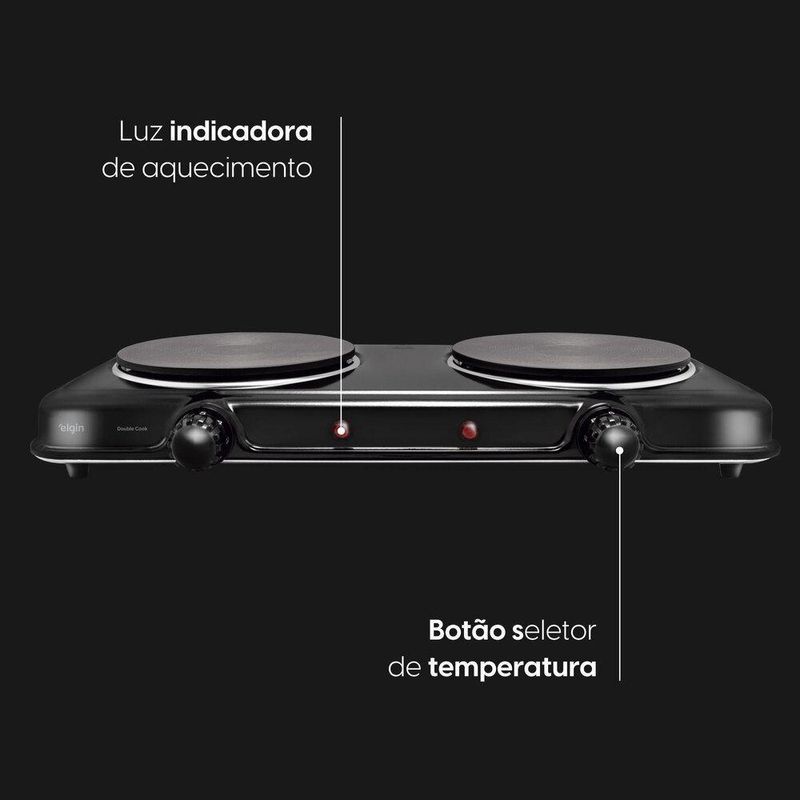 Fogão Elétrico Cooktop Portátil 2 Bocas - 220VConheça o Fogão Portátil Cooktop de Mesa com 2 Bocas da Elgin, com qualquer tipo de panela.Com alta potência, ele possui duas placas de aquecimento que somam Watts, proporcionando aquecimento rápido e mantendo a temperatura por mais tempo.Seu controle de temperatura oferece 5 níveis, com controles independentes para cada boca, garantindo praticidade no preparo de diferentes pratos. Para sua , o cooktop conta com indicação luminosa e termostato, evitando o superaquecimento.Características:5 níveis de temperaturaUse qualquer tipo de panela Alta potênciaChapa com em cada bocaLuz indicadora de aquecimento2 Bocas compacto e versátilProteção contra superaquecimentoGarantia expressa de 1 anoEspecificações Técnicas:Nome do produto: Fogão Elétrico Cooktop Portátil 2 Bocas - 220VEAN: 7908412515514Voltagens: 220V
