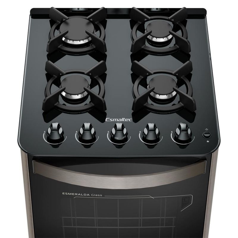 Fogão Esmaltec Esmeralda Glass 4 Bocas Inox Com Forno Autolimpante E Acendimento AutomáticoDesign Full GlassFrente total em vidro temperado. Elegância e facilidade para limpar.Mesa de vidro temperadoQualidade e alta resistência.Trempes de ferro fundido e individuaisSegurança e estabilidade para as panelas.Acendimento automático totalMais economia e praticidade.Forno autolimpanteFaz autolimpeza enquanto está em uso.Puxador robusto em alumínio escovadoModernidade e elegância.Alça lateralFacilita o transporte e deslocamento para a limpeza.E-SensorIndica o momento exato em que o forno está pré-aquecido. Mais comodidade e precisão no preparo dos pratos.Prateleiras no forno1 ajustável e 1 auto deslizante.Luz no forno Cor: Inox | Tipo de Fogão: Piso | Tipo de Mesa: Vidro | Quantidade de Bocas: 4 | Tipo de acendimento: Automático | Tipo de Alimentação: GLP | Voltagem: Bivolt
