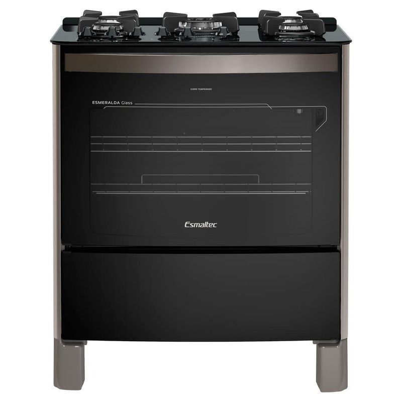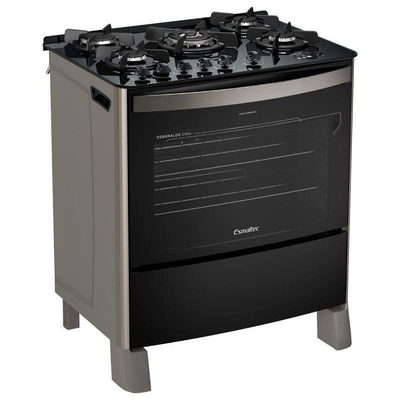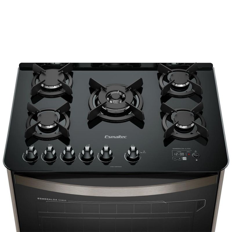 Fogão Esmaltec Esmeralda Glass Gourmet 5 Bocas Inox Com Timer Digital E Grill ElétricoDesign Full Glass: Frente total em vidro temperado. Elegância e facilidade para limpar.Mesa de vidro temperado: Qualidade e alta resistência.Timer digital touch e Grill elétrico: Praticidade e precisão no preparo das receitas.Queimador Wok – 5Q: Três anéis de chama. Potência e agilidade na hora de cozinhar.Trempes de ferro fundido e individuais: Segurança e estabilidade para panelas.Acendimento automático total: Mais economia e praticidade.Forno autolimpante: Faz autolimpeza enquanto está em uso.Puxador robusto em alumínio escovado: Modernidade e elegância.Alça lateral: Facilita o transporte e deslocamento para a limpeza.E-Sensor: Indica o momento exato em que o forno está pré-aquecido. Mais comodidade e precisão no preparo dos pratos.Prateleiras no forno: 1 deslizante e 1 auto deslizante.Luz no forno Cor: Inox | Tipo de Fogão: Piso | Tipo de Mesa: Vidro | Quantidade de Bocas: 5 bocas | Tipo de acendimento: Automático | Tipo de Alimentação: Gás | Dimensões sem embalagem AxLxC (mm): 938 x 767 x 598 | Classif. Mesa/Forno: A/A | Voltagem: Bivolt
