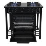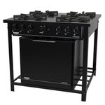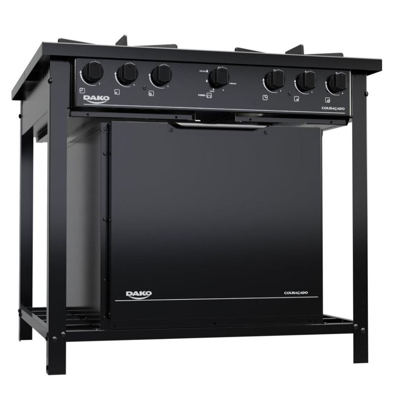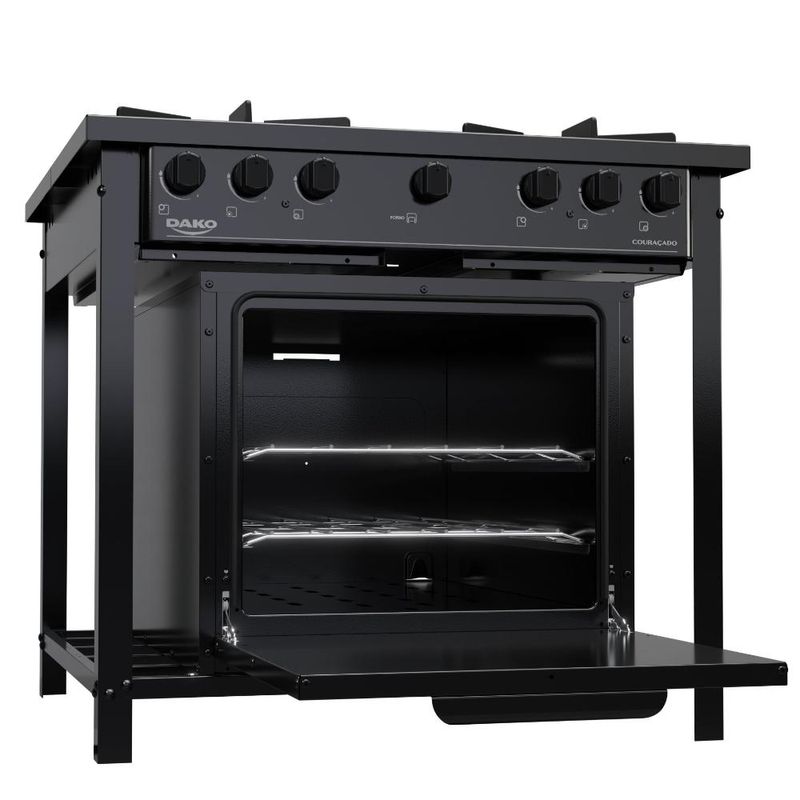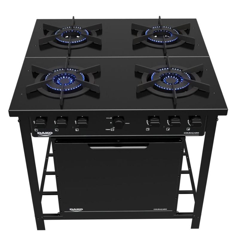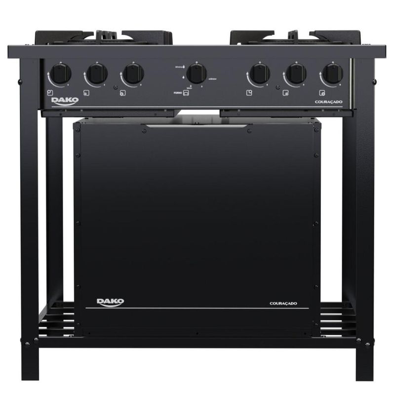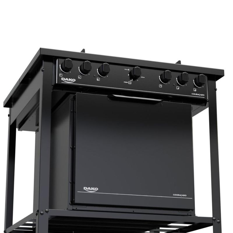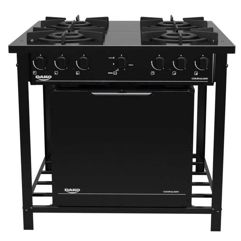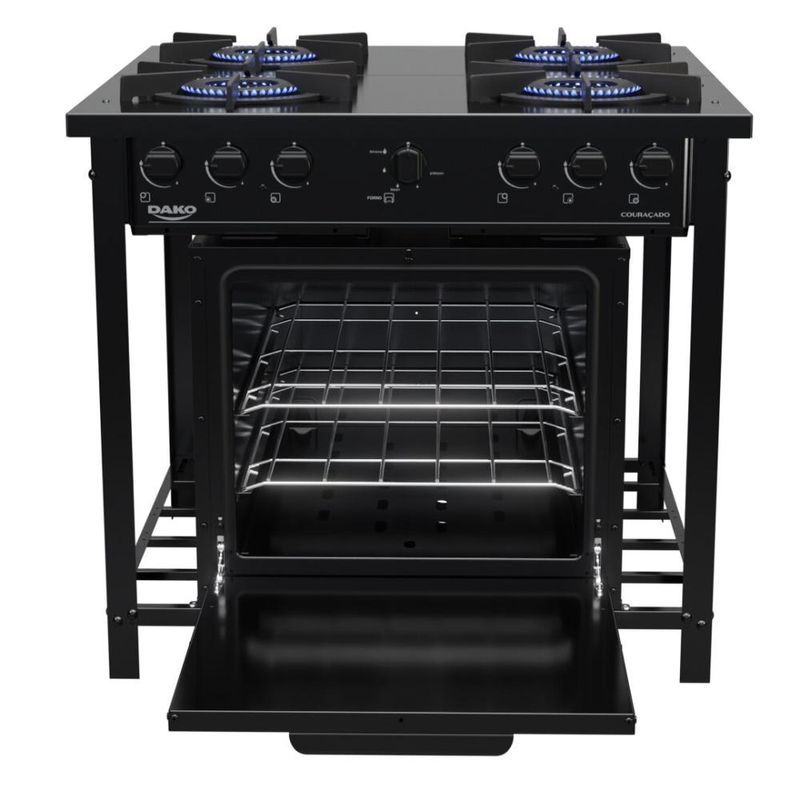 O Fogão Industrial 4 Bocas Preto com Forno e Tripla Chama Dako Couraçado conta com forno e mesa em aço esmaltado com revestimento Limpa Fácil, 107 litros de capacidade no forno, 2 grades deslizantes, 2 queimadores Tripla Chama de 5,2kW e 2 queimadores Dupla Chama de 4,3kW, grades de ferro fundido com 6 pontos de apoio, bandeja coletora de resíduos e base em treliça para armazenamento e suporte.Ficha Técnica:Cor: PretoLinha: CouraçadoQuantidade de Bocas: 4 bocasTipo de Acendimento: ManualGarantia: 12 MesesAcabamento da Mesa: Aço EsmaltadoInstalação: Fogão de PisoTurbo Convecção: NãoDimensões do Produto (largura x altura x profundidade): 84 x 78,9 x 83,8 cmGrill: NãoFuncionamento: GásCapacidade do Forno: 107 LitrosAcabamento do Forno: Limpa FácilLuz no Forno: NãoVidro do Forno: Vidro DuploTampa: NãoTrempes: Individual de ferro fundido com 6 pontos de apoioGrades do Forno: 2 Grades deslizantesTimer Digital: NãoBotões Removíveis: SimFabricação: NacionalPotência dos Queimadores: 2 queimadores frontais Dupla Chama de 5,2kW e 2 queimadores traseiros Dupla Chama de 4,3kWEficiência Energética: AEAN: 7897180509118