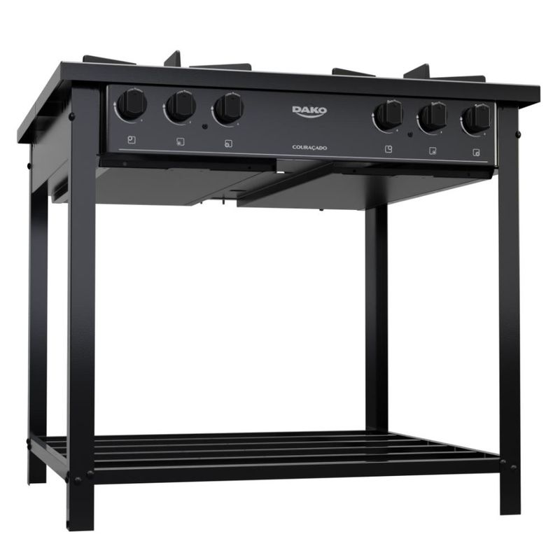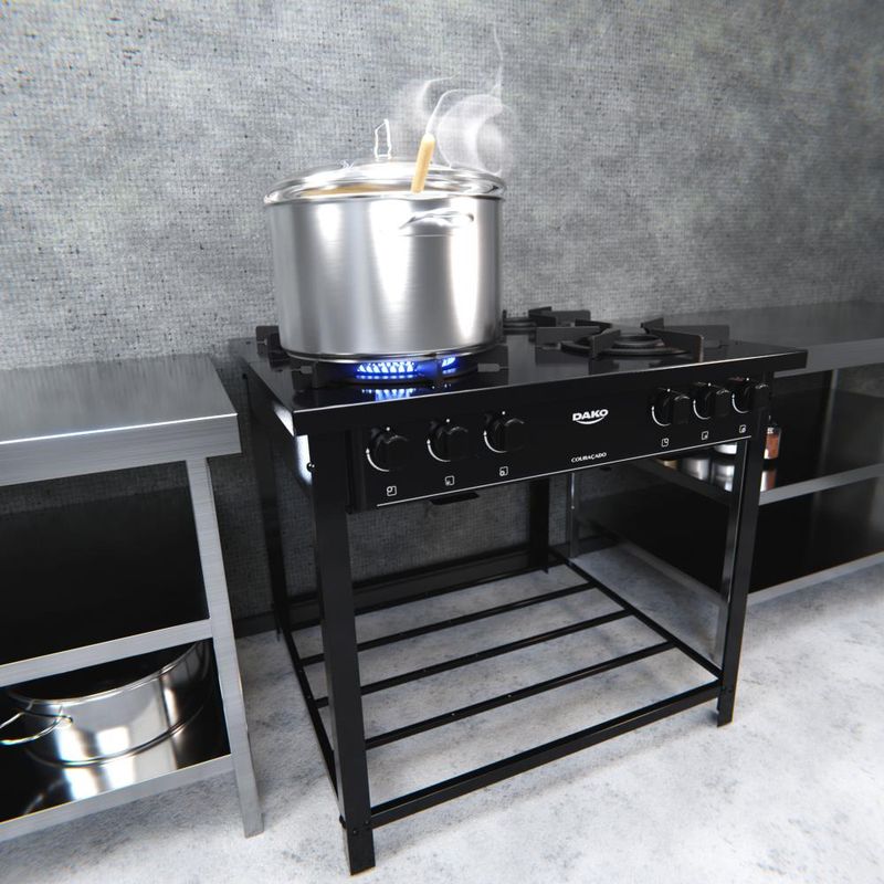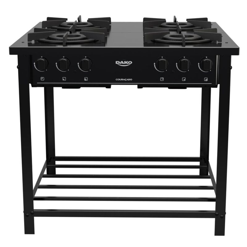 Fogão Industrial 4 Bocas Preto com Tripla Chama Dako Couraçado: Tradição e versatilidadeO novo fogão industrial Dako Couraçado conta com mesa em aço esmaltado com revestimento Limpa Fácil; ignição manual; 4 queimadores, sendo 2 frontais com Tripla Chama de 5,2kW e duplo controle e 2 traseiros com Dupla Chama de 4,2kW; grades extra largas e robustas de ferro fundido com 6 pontos de apoio, que suportam grandes panelas; bandeja coletora de resíduos e base em treliça para armazenamento e suporte.Cor: PretoLinha: CouraçadoQuantidade de Bocas: 4 bocasTipo de Acendimento: ManualGarantia: 12 MesesAcabamento da Mesa: Aço EsmaltadoInstalação: Fogão de PisoTurbo Convecção: NãoDimensões do Produto (largura x altura x profundidade) 84 x 78,9 x 83,8 cmGrill: NãoFuncionamento: GásVidro do Forno: Produto Sem FornoTampa: NãoTrempes: Individual de ferro fundido com 6 pontos de apoioTimer Digital: NãoBotões Removíveis: SimFabricação: NacionalPotência dos Queimadores: 2 queimadores frontais Tripla Chama de 5,2kW e 2 queimadores traseiros Dupla Chama de 4,2kWSistema Corta/Bloqueia Gás: NãoModelo: Baixa Pressão *Não vendemos para CNPJ neste canal de vendas. Compras realizadas com CNPJ serão automaticamente canceladas.