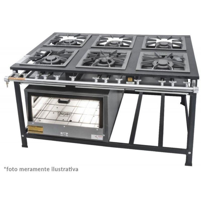 Fogão Industrial Tradicional 40x40 6 Bocas Com Forno Itajobi Fogão Baixa Pressão 40x40Fogão Industrial Tradicional 40x40 Baixa Pressão 6 Bocas com Forno Itajobi. Ideal para cozinhas, restaurantes, bares e . Confeccionado em chapa aço inox 430. Possui 6 bocas de baixa pressão, sendo: 3 queimadores simples e 3 queimadores duplos, fabricados em ferro fundido. Tubo coletor de gás zincado e bandeja coletora de resíduos. CONSUMO DE GÁS QUEIMADOR SIMPLES: 0,200kg/hr. CONSUMO DE GÁS QUEIMADOR DUPLO: 0,360kg/hr. DIMENSÕES(CxAxL): 152x80x111cm. CAPACIDADE DO FORNO: 87 Litros. Fogão Industrial Tradicional 40x40 Baixa Pressão 6 Bocas com Forno Itajobi é na Atau.Tamanho - 6 BocasModelo - 40x40 Com Forno