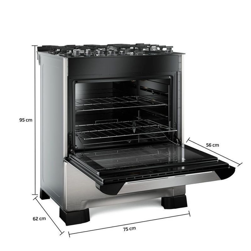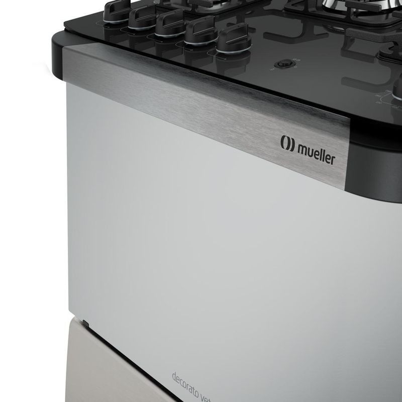 Fogão Mueller 5 Bocas Decorato Vetro Inox Com Mesa De Vidro InoxOs fogões Decorato Vetro foram feitos para as pessoas que vêem na cozinha o espaço perfeito para expandir a criatividade, descobrir habilidades, aperfeiçoar técnica e saborear os bons momentos da vida. Inspire-se a criar com estes fogões!Características:Queimadores: base em alumínio e espalhador em aço esmaltado preto foscoGrades de mesa (quantas): 5 grades integradas em ferro fundidoBotões: Manípulos removíveis que garantem uma maior facilidade de limpezaLuz no interior do Forno: Sim - a lâmpada não acompanha o produtoPrateleiras do forno: Forno com duas prateleiras de altura ajustávelEspecificações Técnicas:Bocas: 5 BocasVoltagem: BivoltTipo do Fogão: A Gás, de PisoCapacidade do Forno: 98 litrosTipo de acendimento: AutomáticoMesa: em vidro temperadoQueimador Tripla Chama: 3700 Watts de potênciaQueimador Ultra Chama: 2600 Watts de potênciaQueimador família: 2000 Watts de potênciaQueimador médio: 1700 Watts de potênciaQueimador do forno: 3000 watts de potênciaAltura (cm): 95cmLargura (cm): 75cmProfundidade (cm): 62cmPeso (Kg): 35,9KgDimensões internas do forno (AxLxP): 36cm x 60cm x 45cmImportante:Seu fogão é bivolt, mas a lâmpada do forno possui voltagem de 127V ou 220V. O forno virá sem a lâmpada, é necessário que você adquira a lâmpada, modelo E14 de 15W, de acordo com a voltagem de sua residência.Os fogões Mueller saem da regulados e preparados para funcionar com gás liquefeito de petróleo (GLP). Para a conversão do produto para Gás Natural GN é necessário solicitar o de um dos nossos postos autorizados. Assim que receber seu produto, com o Mueller e solicite sua conversão. Será necessário informar o de série do produto. A conversão é dentro do prazo de garantia se o produto não tiver sido utilizado.Na hora de instalar seu fogão observe se o regulador de gás e mangueira estão dentro da validade. Confira o ano de vencimento gravado no regulador e também na mangueira. Eles não devem ser utilizados por mais de 5 anos. Ao comprar um regulador , observe a medida kg/h. Reguladores de 1 kg/h são ideais para os tradicionais eletros de 4 bocas, já os de 2 kg/h são recomendados para eletros de 5 bocas ou com queimadores como o Tripla ou Dupla Chama.