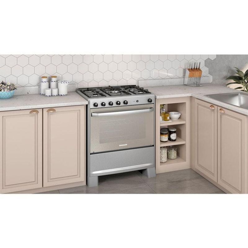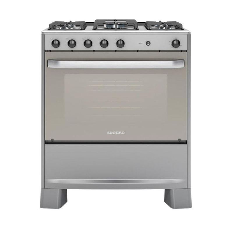 Fogão Select Prata Mesa Inox 5 Queimadores Bivolt Fgisl510prix Suggar BivoltDescriçãoVANTAGENS DO PRODUTO Acendimento automático na mesa e no forno Forno Fácil Limpeza Mesa inox escovada Trempes duplas em ferro fundido Queimador tripla chama Porta espelhada Capacidade forno: 90L Luz no forno - a lâmpada não acompanha o produto Controle de temperatura do forno 180°C a 280°C Pés elevados que facilitam a limpeza do piso Queimadores injetados Forno com válvula de segurança Dobradiças italianas: amortecem o fechamento da porta Proteção térmica com vidro duplo no forno 1 grade fixa e 1 grade deslizante com 3 níveis de ajuste no forno Puxador em alumínio escovado Ver mais detalhes MEDIDAS DO PRODUTO ProdutoCom embalagem Altura 91,3 Largura 75,0 Profundidade 63,7 Peso 30,5 ESPECIFICAÇÕES TÉCNICAS Nome do produto: Fogão Select 5 Queimadores Cor: Inox Modelo Bivolt: FGISL510PRIX Código EAN Bivolt: 790.831.281.955-2 Qtd. pçs. caixa: 1Sobre o produtoDeixe sua cozinha ainda mais prática e elegante com o fogão SELECT INOX 5 QUEIMADORES SUGGAR. Sua mesa em inox escovado, além de dar um toque de modernidade e requinte para a sua cozinha, garante resistência e alta durabilidade. Com acendimento automático total na mesa e no forno, este fogão oferece praticidade incomparável na hora de cozinhar. Seu forno possui capacidade para 90 litros e conta com revestimento para facilitar a limpeza e simplificar suas tarefas diárias. Com uma grade fixa, uma deslizante com três níveis de ajuste, facilita a entrada e saída dos alimentos e ainda conta com dobradiças italianas que amortecem o fechamento da porta. Suas trempes duplas em ferro fundido, garantem estabilidade e segurança ao cozinhar. Modelo: FGISL510PRIX | Garantia: 12 Meses | Tipo de montagem: De Piso | Quantidade de queimadores: 5 | Marca: Suggar | Cor: Inox | Baterias são necessárias?: | Dimensões do item P x L x A: | Principais Características do Produto 1: | Principais Características do Produto 0: | Elemento de aquecimento: | Principais Características do Produto 2: | Número do modelo: | Palavras-chave de Pesquisa: | Fabricante: | Componentes incluídos: | Certificação de teste externa: | O item é autorizado pelo OEM?: | Número da peça: | Descrição da garantia: | Número de caixas: | Fonte de energia: | Voltagem: Bivolt
