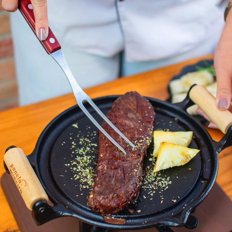 Fogareiro Fogo Forte com Bifeteira Ferro Panela Mineira 22cm O Fogareiro Fogo Forte Com Bifeteira Alça de Madeira da Panela Mineira é um produto moderno, prático e eficiente, que apresenta alto desempenho no preparo de diversas receitas. O calor distribuído por toda a superfície faz com que o alimento cozinhe de maneira uniforme, conservando suas propriedades e nutrientes, o que a torna excelente para selar, grelhar, fritar, cozinhar e mais. Acompanha fogareiro, composto de base, espiriteira (recipiente onde coloca-se álcool), regulador de chama, suporte e grelha. O fogareiro deve ser aceso com o álcool em gel 70% ou 90%. Sua capacidade é de aproximadamente 300ml, o suficiente para manter a chama acesa por cerca de 1h30. Onde usar a Chapa: Pode ser utilizado em fogões a gás, a lenha, elétricos, cooktops de indução e vitro-cerâmicos. A alça de madeira não permite que o produto seja levado ao forno, churrasqueira ou fogo de chão. Orientação de Uso e Conservação:Antes do primeiro uso: Lave com água e sabão, seque bem com um pano e leve ao fogo para remover toda a umidade. Já vem pronta para uso, então não precisa ser curada. Guarde em um local seco. Após cada uso: Lave com água e sabão, usando uma esponja ou escova para remover todos os resíduos de alimentos. Se restarem resíduos, ferva água com um pouco de detergente para soltá-los. Pintura: Revestimento atóxico que garante durabilidade e proteção prolongada, sem causar nenhum dano à saúde. Características Técnicas e Medidas: Linha: Bares e Restaurantes.Material: Ferro Fundido.Modelo: Redondo.Diâmetro: 22,5cm.Alças: Madeira.Altura: 14cm.Peso: 3,2Kg.Chapa: Lisa. Itens Inclusos: 01 Chapa Bifeteira Alça de Madeira Chapa Lisa 22,5cm.01 Suporte Fogareiro em Ferro Fundido.01 Regulador Chama.01 Espiriteira. Código: 778PMProdutoLojaPlast.