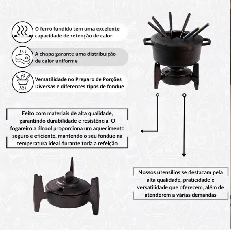 A Fondue de Ferro Preto 1,6 Litros com 6 Espetos Santana é perfeita para reunir amigos e familiares em torno de uma deliciosa refeição. Com sua panela de ferro de alta qualidade, você pode preparar fondue de queijo, chocolate ou carne de forma prática e elegante. Acompanhada de 6 garfos e um fogareiro, esta fondue é ideal para compartilhar momentos especiais. A tampa inclusa ajuda a manter a temperatura dos alimentos, garantindo uma experiência gastronômica única. Com capacidade de 1,6 litros, é ideal para servir até 6 pessoas.