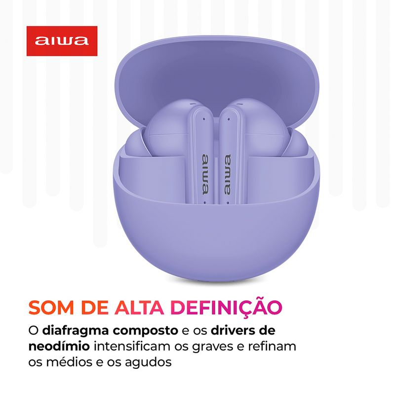 Descubra cada detalhe das suas músicas com o AWS-EB-04-P, da AIWA! Equipado com diafragma composto e drivers de neodímio, esses fones de ouvido sem fio realçam graves potentes e trazem médios e agudos nítidos, proporcionando uma experiência sonora rica e equilibrada. O Cancelamento Ativo de Ruído (ANC) elimina interferências e reduz o som ambiente em até -23 dB, para oferecer uma imersão total. Já em momentos que é preciso manter a atenção no que acontece ao redor, basta ativar o Modo Ambiente para ouvir o som externo sem precisar remover o os fones. Além de todos esses benefícios, as conversas por áudio e vídeo vão ficar ainda melhores com o Aprimoramento de Voz para Chamadas (ENC). São 4 microfones integrados, que capturam cada detalhe da voz com precisão, proporcionando chamadas de vídeo e áudio mais nítidas. Com design moderno e tecnologias avançadas, os fones AWS-EB-04-P combinam estilo e alta performance para elevar sua experiência sonora no dia a dia! Som de alta definição: Som claro e envolvente, graças à combinação do diafragma composto com os potentes drivers de neodímio, tecnologia que destaca os graves e aprimora os médios e agudos. Desfrute de uma experiência auditiva mais nítida e rica em cada nota. Cancelamento Ativo de Ruído (ANC): Para uma experiência imersiva na música, nos vídeos e jogos, o AWS-EB-04-P é equipado com o Cancelamento Ativo de Ruído (ANC), que reduz o barulho do ambiente em até -23 dB. Desligue-se dos ruídos externos; Modo ambiente: Para aqueles momentos em que é preciso interagir com o mundo externo sem precisar tirar os fones – permite ouvir vozes e sons ao redor com total clareza; Aprimoramento de Voz para Chamadas (ENC): Com 4 microfones integrados, este fone captura cada detalhe da voz com precisão, proporcionando chamadas de vídeo e áudio mais nítidas; Bateria com capacidade de até 26 horas: Ouça suas playlists em viagens, treinos ou qualquer outro rolê sem se preocupar com a bateria; Baixa Latência: Áudio sempre em sincronia com o vídeo, perfeito para quem adora assistir a filmes, séries ou jogar. Diga adeus ao desencontro entre som e imagem! Proteção IPX4: Resistente a suor e a respingos de líquidos, o Earbud AWS-EB-04-P pode acompanhar nos treinos, no trabalho e nas aventuras pelas ruas. A música não vai parar, independentemente de onde você estiver; Bluetooth 5.4: Com a tecnologia Bluetooth 5.4, o Earbud AWS-EB-04-P oferece uma conexão rápida e estável, com latência de apenas 47ms, ou seja, um áudio quase instantâneo, sem atrasos, mesmo em ambientes com interferências. Desfrute dessa experiência e deixe a música fluir; Integração com Assistente de Voz por Toque: Ative seu assistente de voz favorito sem precisar tirar os fones de ouvido. Basta tocar 4 vezes no fone direito ou esquerdo e se manter conectado!