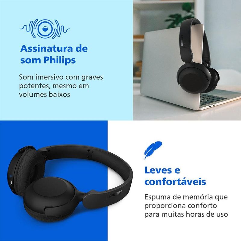 Fone de Ouvido Philips TAH2209BK/00 - Leve e confortável para até 25h de música! Fone de Ouvido Philips TAH2209BK/00 é do tipo Headphone (On-Ear) que fica sobre as orelhas, sem cobri-las completamente, é confortável e dobrável para uso diário. Com até 25 horas de bateria, graves dinâmicos e som natural. Perfeito para ouvir músicas, podcasts ou atender chamadas com clareza e qualidade de som.Conforto prolongado Alça acolchoada ultraleve e as conchas auriculares com espuma de memória se ajustam ao formato da orelha, garantindo conforto mesmo em longas sessões de uso.Som de alta qualidadeDrivers de 32 mm com isolamento acústico passivo proporcionam áudio limpo e envolvente. Ative os graves dinâmicos e aproveite mais potência, mesmo em volumes baixos.Bateria de longa duraçãoAté 25 horas de reprodução contínua. Uma carga rápida de 15 minutos garante mais 1 hora de música. Carregamento completo em apenas 2 horas via USB-C.Conectividade inteligenteBluetooth 5.4 com conexão estável e multiponto, permitindo emparelhar dois dispositivos simultaneamente (iOS e Android). Inclui microfone integrado com redução de ruído para chamadas nítidas e suporte aos assistentes de voz Siri e Google.Design dobrável e práticoLeve-os para qualquer lugar. O formato compacto com dobras planas facilita guardar no bolso ou mochila, unindo estilo e praticidade. 25h de reprodução + recarga rápidaDrivers de 32 mm com graves dinâmicosBluetooth 5.4 com conexão multipontoDesign leve, dobrável e confortávelConheça mais produtos com a qualidade e tecnologia Philips!