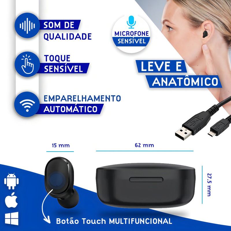 Atenção: Produto compatível, de marca genérica, sem nenhuma correção com marcas de smartphones.Aproveite o máximo da sua experiência sonora com o Fone de Ouvido Bluetooth TWS com estojo carregador e visor digital. Moderno, compacto e eficiente, este fone foi desenvolvido para quem busca liberdade sem abrir mão da qualidade de som. Com tecnologia Bluetooth 5.1, oferece conexão rápida e estável com seu smartphone, tablet ou computador. Ideal para ouvir músicas, podcasts e realizar chamadas com nitidez, ele possui microfone integrado e sistema de redução de ruídos, garantindo clareza mesmo em ambientes movimentados. Seu estojo de carregamento portátil possui visor digital em LED, que exibe o nível de carga da bateria com precisão. A autonomia dos fones permite horas de reprodução contínua, enquanto o estojo recarrega os fones automaticamente sempre que armazenados. O desgn ergonômico se ajusta confortavelmente ao ouvido, proporcionando segurança mesmo em movimentos intensos, como caminhadas, treinos ou corridas. Além disso, os botões sensíveis ao toque oferecem controle prático das funções de música e chamadas sem necessidade de retirar o celular do bolso. Compatível com Android e iOS, é a escolha perfeita para quem busca praticidade, estilo e desempenho em um único produto. Leve, funcional e elegante, o Fone TWS redefine sua rotina com som de qualidade e mobilidade total.