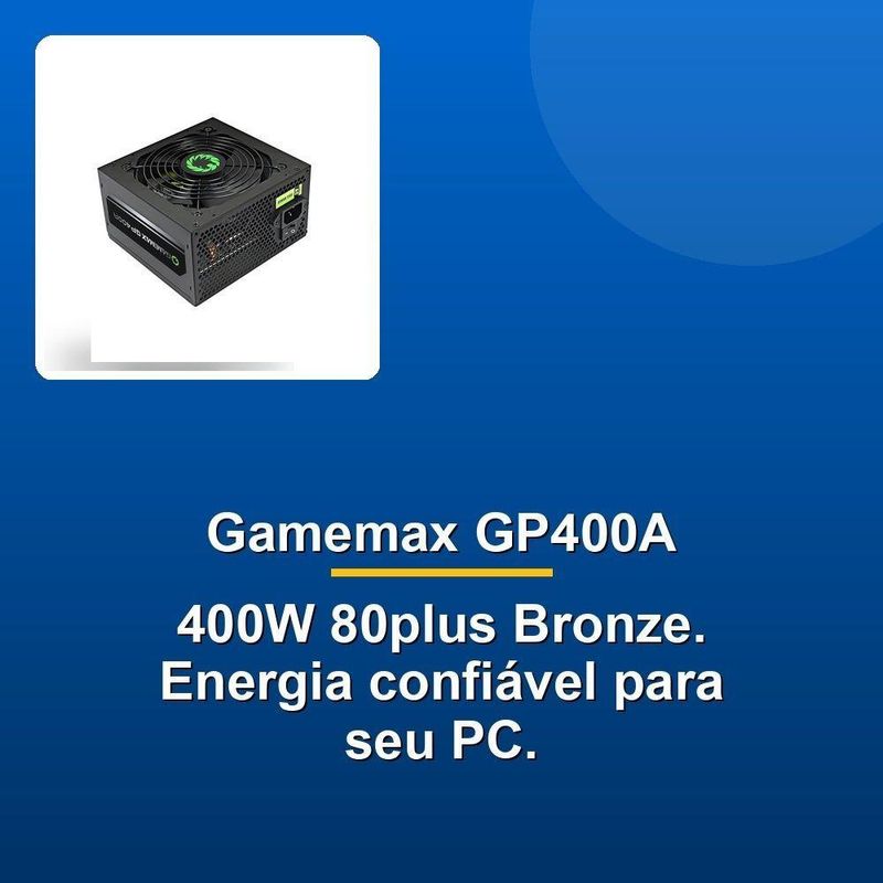 Fonte Atx Gamemax Gp400a 400w Real 80plus/bivoltA fonte de alimentação Gamemax GP400A é a escolha ideal para quem busca performance e confiabilidade em sua máquina. Com 400W de potência e certificação 80Plus Bronze, ela garante eficiência energética de até 85%, reduzindo gastos e mantendo seu sistema funcionando em temperatura ideal. A GP400A possui um único trilho de +12V, proporcionando alta compatibilidade e corrente suficiente para alimentar processadores e placas de vídeo de alto desempenho.A instalação é facilitada pelos pinos de 20+4 e 4+4 pinos de comprimento extra, que atendem a gabinetes de torre de ponta. Para garantir um funcionamento silencioso, a GP400A vem equipada com um ventilador silencioso de 12cm que regula automaticamente a velocidade de acordo com a temperatura, evitando excessos de ruído.Com diversas proteções, como OVP, UVP, OPP, SCP e SIP, sua placa mãe, CPU e outros componentes são protegidos contra surtos de energia e outros problemas que podem danificá-los. A GP400A é também certificada CE e possui a garantia RoHS e Erp 2013, comprometendo-se com a segurança e o meio ambiente.Se você busca uma fonte de alimentação confiável, eficiente e com excelência na qualidade de energia, a Gamemax GP400A é a escolha certa para suas necessidades.A fonte de alimentação Gamemax GP400A é a escolha ideal para quem busca performance e confiabilidade em sua máquina. Com 400W de potência e certificação 80Plus Bronze, ela garante eficiência energética de até 85%, reduzindo gastos e mantendo seu sistema funcionando em temperatura ideal. A GP400A possui um único trilho de +12V, proporcionando alta compatibilidade e corrente suficiente para alimentar processadores e placas de vídeo de alto desempenho.A instalação é facilitada pelos pinos de 20+4 e 4+4 pinos de comprimento extra, que atendem a gabinetes de torre de ponta. Para garantir um funcionamento silencioso, a GP400A vem equipada com um ventilador silencioso de 12cm que regula automaticamente a velocidade de acordo com a temperatura, evitando excessos de ruído.Com diversas proteções, como OVP, UVP, OPP, SCP e SIP, sua placa mãe, CPU e outros componentes são protegidos contra surtos de energia e outros problemas que podem danificá-los. A GP400A é também certificada CE e possui a garantia RoHS e Erp 2013, comprometendo-se com a segurança e o meio ambiente.Se você busca uma fonte de alimentação confiável, eficiente e com excelência na qualidade de energia, a Gamemax GP400A é a escolha certa para suas necessidades.