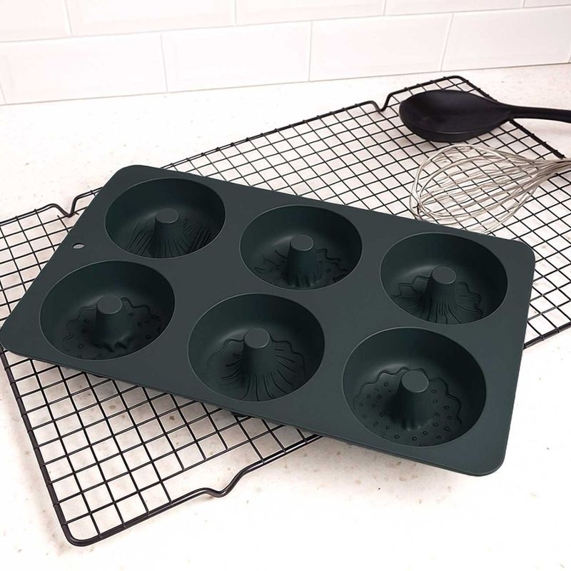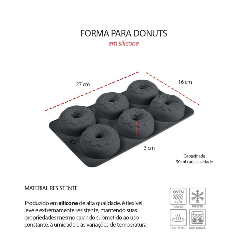 A Forma de Silicone é perfeita para preparar receitas com praticidade, resistencia e segurança. Produzida em silicone, é flexivel, duravel, resistente ao calor e de facil higienizaçao. Suporta temperaturas de aproximadamente -40 °C a 230 °C, garantindo versatilidade no uso. Com 6 cavidades de 90 ml cada, com resultados uniformes e desmolda com facilidade, sem grudar. Pode ser usada no forno, freezer e air fryer, tornando o preparo muito mais rapido e pratico para donuts, rosquinhas e bolos. Contem:1 Forma de Silicone Medidas: 27 x 16 x 3 cm Capacidade: 90 ml cada cavidade Material: Silicone