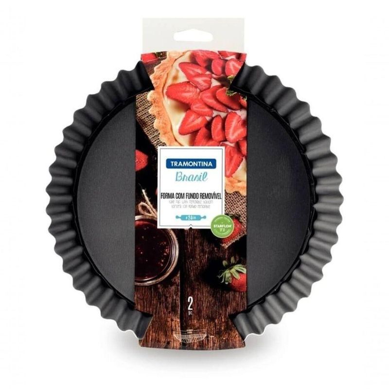 Forma Fundo Removível Tramontina Alumínio 24cm 1,4l GrafiteA linha éfabricada em alumínio com antiaderente Starflon T1. São fôrmas e assadeiras dosmais diferentes modelos para você soltar sua imaginação e cozinhar compraticidade.COMPOSIÇÃORecomendações de Uso:Antes do uso: Lave interna e externamente a fôrma, usando apenas uma esponja macia, sabão neutro ou detergente líquido. Enxugue bem com um pano seco e unte todas as partes internas com óleo ou gordura. Leve ao fogo baixo por um ou dois minutos. Deixe a peça esfriar, lave e enxugue de uso: A partir daí, você pode usar seu produto Starflon T1, com ou sem gordura, dependendo de sua preferência. Durante o uso evite esquentar demais o produto vazio. Use seu produto Starflon T1 sempre em fogo baixo ou médio para reter o valor nutritivo dos alimentos e conservar o antiaderente. Evite que as chamas atinjam as laterais do produto. Os produtos com antiaderente não pode ser aquecidos a temperaturas superiores a 350°C. Para mexer ou tirar o alimento, use somente utensílios de silicone, nylon ou madeira que não cortam e não riscam a superfície dos produtos Starflon T1. Nunca corte alimentos diretamente no revestimento ós o uso: Evite a imersão do produto quente em água fria. Deixe o produto esfriar antes de lavar. Mesmo depois de vários usos nunca utilize produtos abrasivos na lavagem de seu antiaderente, como saponáceos ou palhas de aço. Se deixar queimar alimentos, deixe seu produto de molho em água durante algum tempo antes de lavá-la. O seu produto Starflon T1 pode ir à máquina de lavar louça e, antes do próximo uso, o ideal é que se repita as recomendações do item Antes do uso. Ao utilizar utensílios mantenha fora do alcance de crianças. Ao manusear utensílios quentes tenha cuidado redobrado e se necessário utilize proteção para as mãos. Para sua maior ao utilizar utensílios com cabos, mantenha os mesmos sempre voltados para o centro do fogão.- Foto meramente ilustrativa.Informações Adicionais:- forma em alumínio com revestimento interno e externo em antiaderente Starflon T1.- Devido ao revestimento antiaderente os alimentos não grudam, proporcionando facilidade na limpeza.- Proporciona um cozimento rápido e uniforme.- Design moderno e diferenciado.- Pode ser utilizada no forno a gás e elétrico.- Pode ir à máquina de lavar louças.- Seguindo as instruções de uso, a assadeira permanecerá bonita por muito mais tempo.