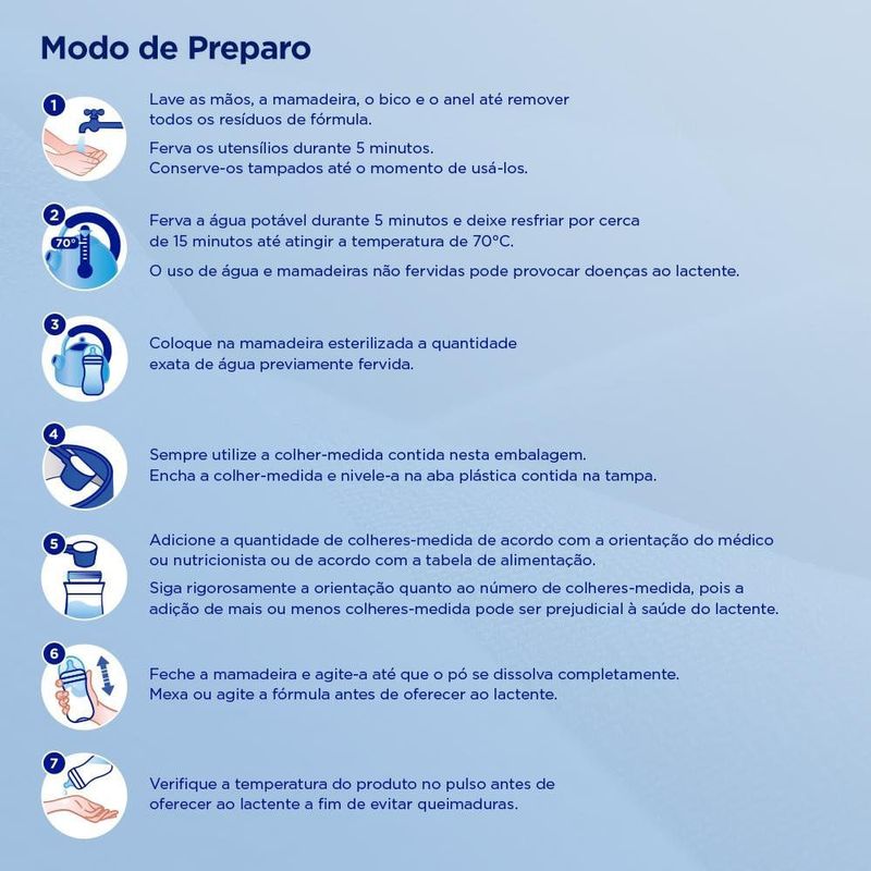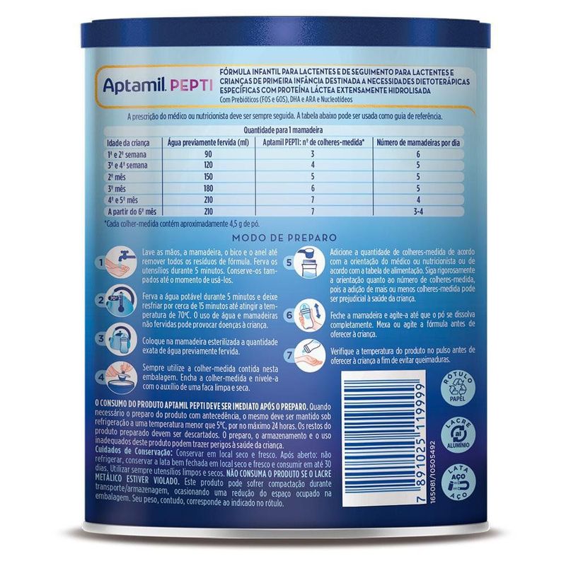 O que é Aptamil Pepti? Aptamil Pepti é uma fórmula infantil especialmente desenvolvida para bebês e crianças de até 3 anos que necessitam de cuidados dietéticos específicos. Contém proteína do leite extensivamente hidrolisada, prebióticos, DHA, ARA e nucleotídeos, proporcionando nutrição completa e equilibrada. Características: Ideal para lactentes de 0 a 3 anosProteína do leite extensivamente hidrolisadaEnriquecido com DHA e ARAContém prebióticosInclui nucleotídeosConsulte sempre um pediatra ou nutricionista Como preparar Aptamil Pepti? Higienização: Lave bem as mãos, a mamadeira, o bico e o anel. Ferva todos os utensílios por 5 minutos e mantenha-os tampados até o uso.Água: Ferva água potável por 5 minutos e deixe esfriar até cerca de 70°C por 15 minutos.Medida da água: Coloque na mamadeira a quantidade exata de água fervida.Medida do pó: Utilize a colher-medida inclusa, enchendo-a e nivelando-a com uma faca limpa e seca.Mistura: Adicione a quantidade de colheres-medida conforme orientação do médico ou conforme a tabela de alimentação.Agitação: Feche a mamadeira e agite até que o pó se dissolva completamente.Temperatura: Verifique a temperatura da fórmula no pulso antes de oferecer à criança.Consumo imediato: O produto deve ser consumido imediatamente após o preparo. Caso prepare com antecedência, mantenha refrigerado a menos de 5ºC por no máximo 24 horas.Descarte: Descarte os restos da fórmula preparada.Cuidados: O preparo e armazenamento inadequados podem representar riscos à saúde do bebê. Ingredientes: Proteína hidrolisada de soro de leite, maltodextrina, óleos vegetais (palma, canola, coco, girassol), fibras alimentares (galacto-oligossacarídeos, fruto-oligossacarídeos), fosfato de cálcio tribásico, cloreto de potássio, óleo de peixe, cloreto de magnésio, citrato trissódico, óleo de Mortierella alpina, carbonato de cálcio, cloreto de colina, ácido L-ascórbico, taurina, L-ascorbato de sódio, sulfato ferroso, mio-inositol, sulfato de zinco, sal dissódico de uridina 5-monofosfato, citidina 5-monofosfato, acetato de DL-alfa-tocoferila, adenosina 5-monofosfato, sal dissódico de inosina 5-monofosfato, L-carnitina, nicotinamida, D-pantotenato de cálcio, sal dissódico de guanosina 5-monofosfato, D-biotina, sulfato cúprico, ácido N-pteroil-L-glutâmico, palmitato de retinila, DL-alfa-tocoferol, cianocobalamina, cloridrato de cloreto de tiamina, riboflavina, colecalciferol, cloridrato de piridoxina, sulfato de manganês (II), iodeto de potássio, fitomenadiona, selenito de sódio, emulsificante ésteres de mono e diglicerídeos de ácidos graxos com ácidos cítricos. Não contém glúten. Contém lactose. Alérgicos: contém derivados de leite e peixe. Modo de Conservação: Armazenamento: Conservar em local seco e fresco.Após aberto: Não refrigerar, manter a lata bem fechada e consumir em até 30 dias.Higiene: Utilize sempre talheres limpos e secos.Segurança: Não consuma se o lacre metálico estiver violado.