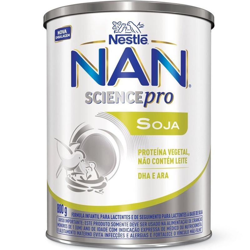 Fórmula Infantil Nan Sciencepro Soja 800g Nutrição especializada para bebês com intolerância ao leite de vaca. A Fórmula Infantil Nan Sciencepro Soja 800g é uma fórmula infantil desenvolvida especialmente para lactentes de 0 a 12 meses, com base em proteína isolada de soja. Indicada para bebês com necessidades alimentares especiais, como alergia à proteína do leite de vaca ou intolerância à lactose, essa fórmula oferece uma nutrição completa e equilibrada. Produzida pela Nestlé, a Nan Soja é enriquecida com DHA e ARA, ácidos graxos essenciais para o desenvolvimento saudável do cérebro e da visão do bebê. Sua composição cuidadosamente selecionada inclui vitaminas, minerais e nutrientes essenciais para o crescimento saudável durante o primeiro ano de vida. Indicação Indicada para lactentes de 0 a 12 meses que necessitam de uma fórmula à base de soja, como em casos de alergia à proteína do leite de vaca, intolerância à lactose ou em situações em que a fórmula sem leite é recomendada por profissionais de saúde. Benefícios Fórmula à base de proteína isolada de soja; Ideal para bebês com intolerâncias ou alergias ao leite de vaca; Contém DHA e ARA para o desenvolvimento cerebral e visual; Fornece vitaminas, minerais e nutrientes essenciais ao bebê; Nutrição segura e equilibrada desde o nascimento até 12 meses. Composição Maltodextrina, proteína isolada de soja, oleína de palma, óleo de soja, óleo de coco, minerais, vitaminas, L-metionina, óleo de Crypthecodinium cohnii, Mortierella alpina, óleo de girassol, lecitina de soja, taurina, L-carnitina e regulador de acidez hidróxido de potássio. Modo de Preparo Lave bem as mãos e os utensílios antes do preparo. Ferva a água potável e deixe-a esfriar até atingir 70°C. Adicione a quantidade de fórmula e água conforme instruções do rótulo. Agite bem a mamadeira até o pó se dissolver completamente. Advertências e Precauções Alérgicos: Contém derivados de soja. Não contém glúten. Utilize somente sob recomendação médica ou de nutricionista. O leite materno é o melhor alimento para o lactente e deve ser priorizado sempre que possível. Aviso Importante Este produto somente deve ser usado na alimentação de crianças menores de 1 (um) ano de idade com indicação expressa de médico ou nutricionista. O Ministério da Saúde adverte: O aleitamento materno evita infecções e alergias e é recomendado até os dois anos de idade ou mais.