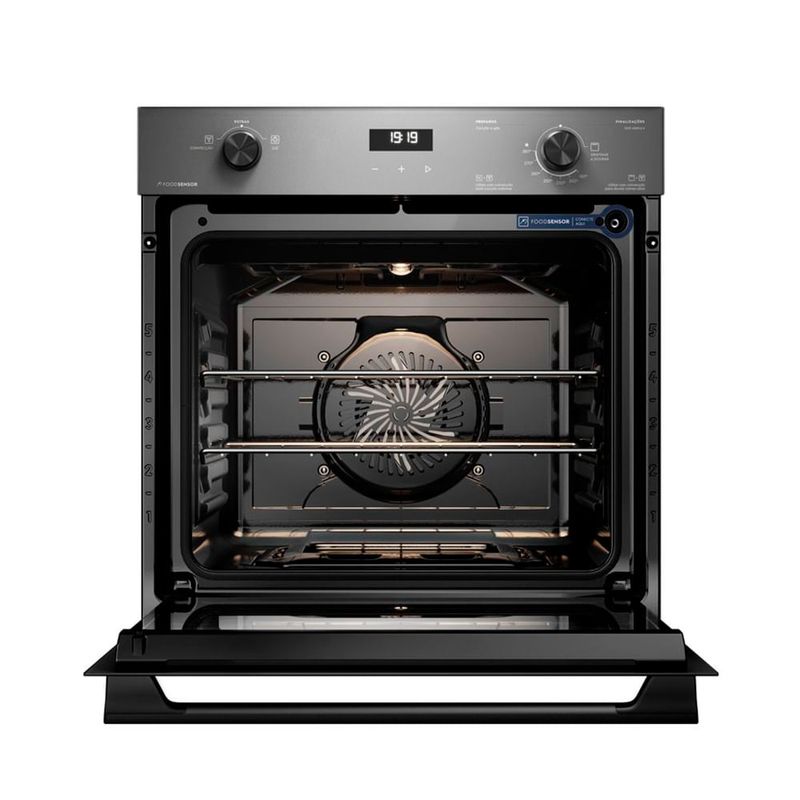 Com Acendimento Automático, Timer, Grill, Painel Full Touch e Acabamento Esmaltado Destaques Painel Full TouchPainel touch em vidro e LED branco que além de trazer sofisticação ao produto, é fácil de usar e proporciona maior interatividade e precisão de temperatura e tempo. PerfectCook360Tecnologia que combina um forno com Cavidade Selada e Convecção e permite assar até 30%* mais rápido e tudo por igual.*Resultados obtidos em testes internos. ConvecçãoAssa tudo por igual através de um ventilador interno que circula o ar quente de forma uniforme e garante uma temperatura homogênea em todos os cantos e alturas do forno. Cavidade SeladaPermite um melhor isolamento térmico no interior da cavidade por meio de uma estrutura com cantos arredondados que retém toda a temperatura dentro forno. Função Gratinar e DourarFinalize suas receitas com essa função ao gratinar e dourar a superfície dos alimentos e obter melhores resultados de textura e crocância. Diferentes Modos de AssarCinco opções de Modos de Assar para um melhor resultado dependendo do tipo do alimento e preparo desejado. Função Manter AquecidoMuito mais praticidade para seu dia a dia para reaquecer ou manter seu prato aquecido após o preparo. Porta e Vidro RemovíveisRemova a porta e o vidro interno com facilidade para uma melhor limpeza do seu forno. Esmaltação FastcleanInterior do forno com esmaltação vitrificada que impede a penetração de sujeiras, facilitando a remoção de gordura e resíduos de comida. Função Trava PainelGarante que o produto não seja acionado ou alterado indevidamente por crianças, por exemplo. CaracterísticasTipo: Gás de embutirTipo de Acendimento: AutomáticoCapacidade: 80 litrosGrillTimer sonoroSistema de Convecção Seletor de TemperaturaForno AutolimpantePainel: Mecânico Full TouchAbertura da Porta: FrontalPorta e Vidro RemovívelLâmpada Inclusa: Sim Vidro na Porta Especificações TécnicasModelo: OE8GFMaterial: EsmaltadoPotência: 1700 WCor: CinzaSelo Conpet (Eficiência Energética): AVoltagem: 220VEAN: 7909569359488Garantia: 12 meses Dimensões e PesoDimensões do produto sem embalagem (AxLxP): 596x596x613 mmDimensões do produto com embalagem (AxLxP): 667x644x670 mmDimensões do nicho (AxLxP): 610x600x600 mmPeso do produto sem embalagem: 24,3 KgPeso do produto com embalagem: 25,5 Kg Instalação do ProdutoInstalação Flush (Alinhado com o móvel) e Instalação Sobreposta (Borda para fora) Itens Inclusos01 Forno02 Prateleiras01 Lampada