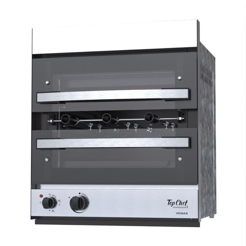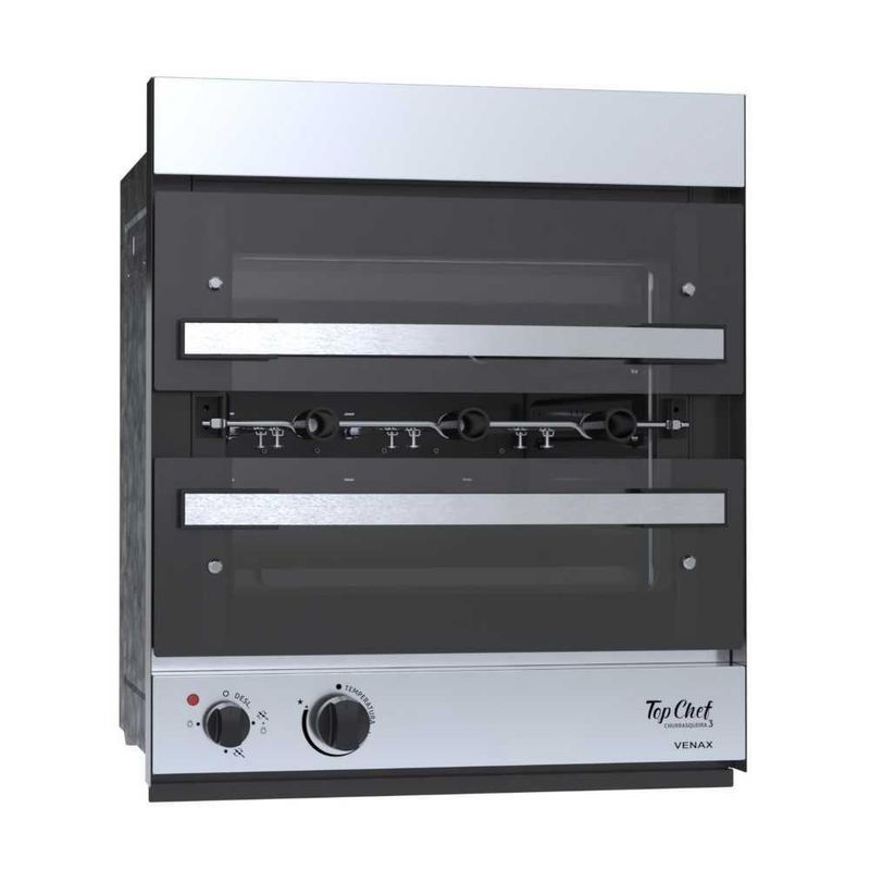 Forno Assador Rotativo A Gás 3 Espetos De Embutir Top Chef Inox - VenaxDESCRIÇÃO DO PRODUTO:- Tipo: Churrasqueira de Embutir;- Alimentação: Gás GLP de Baixa Pressão (A conversão para Gás Natural não é coberta pela garantia);- Acendimento: Super Automático;- Entrada de Gás: Uma Entrada (Lado Direito Visto de Frente);- Ajuste de Temperatura: 5 Posições;- Válvula de Segurança: Sim;- Capacidade Total de Carne: 6 Kg (2Kg por Espeto);- Número de espetos: 3 Rotativos;- Giro do espeto: 2 Rpm;- Queimador: 1 Infravermelho;- Luz Interna: Sim;- Revestimento Interno: Esmalte Easy Clean;- Botões: Removíveis;- Porta removível: Não;- Porta: Vidro Bi Partida;- Orientação: Vertical;- Porta: Bi Partida;- Puxadores das Portas: Alumínio;- Bandeja coletora de Resíduos: Sim;- Marca: Venax;- Isolamento: Lã de Vidro;- Etiquetas: Selo de Segurança;- Garantia: 1 Ano Contra Defeito de Fabricação;ESPECIFICAÇÕES:- Medidas do produto (CxLxA): 602x514x611 mm;- Dimensões Internas do Produto (LxPxA): 365x456x300 (mm);- Temperatura: De 160°C até 230°C;- Potência do Queimador: 2,62 kW;- Volume Interno: 49,9 litros;- Consumo: 0,190 kg/h de GLP;- Frequência: 60Hz;- Inox;- Peso líquido: 21,9 kg;- Peso: 220V. Voltagem: 220V | Modelo: Top Chef