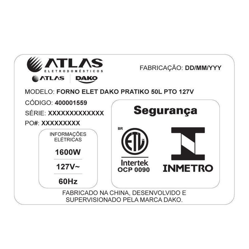 Forno De Bancada Elétrico Dako Pratiko 50L Com Grill Preto 220VForno Elétrico de Bancada PratiKo 50L DakoSe a ideia é ter espaço de sobra para cozinhar com liberdade, o Forno de Bancada PratiKo 50 L Dako entra em cena com tudo: resistente, estiloso e pronto para te acompanhar no preparo de carnes, bolos e aquele toque final crocante que faz a diferença.Na rotina, a grade com 3 níveis de altura se ajusta conforme o preparo, e os 50 litros de capacidade dão conta do recado — da refeição individual ao banquete para a família inteira. Grelhe, aqueça, asse ou toste do seu jeito.O timer de até 120 minutos com desligamento automático e o controle de temperatura de 100 °C a 250 °C garantem que você cozinhe com segurança, praticidade e sem perder o ponto.Potência, eficiência e praticidade? Está tudo aqui. O PratiKo 50 L transforma sua cozinha em uma aliada do dia a dia — para receitas saborosas e uma experiência que vai além do preparo.Atributos e BenefíciosRobusto e Espaçoso – Bonito, resistente e feito para durar. Do café da manhã ao jantar, encara a rotina com estilo.50 Litros de Capacidade – De porções individuais a banquetes. Ideal para receitas rápidas ou reuniões de família.Timer de 120 minutos – Programe o tempo e, ao final, ele desliga automaticamente, trazendo mais comodidade e tranquilidade.Mais versatilidade no preparo – Ideal para gratinar, assar, aquecer, tostar, grelhar ou dourar.Função Grill – Crocância na medida certa para deixar suas receitas ainda mais saborosas.Temperatura ajustável (100°C a 250°C) – Do assado lento ao gratinado rápido, você escolhe a temperatura ideal.Prateleira com 3 níveis de altura – Ajuste conforme sua receita e cozinhe com mais segurança e praticidade.Especificações TécnicasMarca: DakoModelo: PratiKoLinha: PratiKo 50 LitrosTipo: Forno elétrico de bancadaCor: PretoVoltagens: 127V e 220VCapacidade: 50 litrosÉ industrial: NãoPotência: 127V 1600W | 220V 2000WMínima: 100°CMáxima: 250°CControle de temperatura: 100°C a 250°CCom grill: SimTimer: 120 minutosCom luz interna: NãoInclui lâmpada: NãoConvecção: NãoVapor: NãoAirfryer: NãoSensor pré-aquecimento: NãoFood Sensor: NãoComando tátil: NãoTela digital: NãoCom banho-maria: NãoCom chapa: NãoCom tijolos refratários: NãoTipo de porta: Com visorVidro da porta: Simples com Low-ePuxador: Plástico injetadoMaterial dos botões: PlásticoAcabamento interno: GalvanizadoPrateleiras: 1 deslizanteCabo de energia: 96 cmTomada: 127V 20A | 220V 10AProduto (L x A x P): 56,1 x 36,5 x 41,5 cmProduto embalado (L x A x P): 62 x 43 x 44,5 cmPeso do produto: 7,11 kgPeso embalado: 9 kgCondição: NovoGarantia: 12 meses contra defeitos de fabricaçãoAcessórios inclusos: 1 manual do usuário e 1 grade removívelTipo de embalagem: Caixa