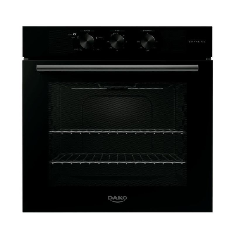 Forno De Embutir Elétrico Dako Supreme 80L Analógico Preto 220VO Forno de Embutir Dako Supreme Transforma Sua Cozinha Com Tecnologia, Praticidade E Design Impressionante. Com 80 Litros de Capacidade, Acomoda Desde Refeições Diárias Até Pratos Elaborados Para Toda a Família.O Acabamento Limpa Fácil Elimina A Preocupação Com A Limpeza Pós-Preparo, Enquanto Os Três Diferentes Modos de Preparo Garantem Versatilidade Para Criar Desde Bolos Delicados Até Carnes Suculentas. A Luz Interna Permite Acompanhar O Ponto Perfeito Sem Abrir A Porta, Preservando A Temperatura Ideal.A Cavidade Interna Selada Com Isolamento Térmico Retém O Calor De Forma Eficiente, Garantindo Economia De Energia E Resultados Consistentes Em Todas As Receitas. O Timer De Duas Horas Proporciona Controle Preciso, Desligando Automaticamente O Forno Ao Final Do Tempo Programado.Um Diferencial Importante É O Vidro Removível, Projetado Com Um Sistema Intuitivo Que Facilita Sua Retirada Para Uma Limpeza Completa E Sem Esforço, Tornando A Manutenção Do Forno Muito Mais Simples No Dia A Dia.A Função Grill Permite Dourar As Receitas, Proporcionando Crocância E Textura Irresistível. Toda A Qualidade Da Linha Supreme, Agora Em Um Forno De Embutir Que Se Integra Perfeitamente À Estética Da Cozinha Moderna.Atributos E Benefícios:Capacidade de 80L: Maior capacidade para atender a todos os tamanhos de travessas e assadeirasDesign Intuitivo: Fácil de usar, permite controlar todas as funções sem precisar do manualCavidade Selada E Isolamento Térmico: Retém o calor, economiza energia e garante cozimento perfeitoVidro Interno Removível: Facilita a limpeza completa e prática do fornoAcabamento Limpa Fácil: Remove sujeira com menos esforçoVidro Duplo: Cozinha de forma homogêneaFunção Grill: Dourado perfeito, crocância e saborTimer De 2 Horas: Programa o tempo de cozimento; desliga automaticamente ao final3 Diferentes Modos de Assar: Permite escolher o ideal para cada receitaEspecificações Técnicas:Marca: DakoVoltagem: 220VFuncionamento: ElétricoFabricação: ImportadoCor: PretoLinha: SupremeInstalação: Forno de EmbutirPeso do Produto: 27,9 kgCapacidade do Forno: 80 LPainel: AnalógicoManípulos: SimPuxador: AlumínioAlimentação: ElétricoGrill: SimPotência do Grill: 1035 WResistência Superior: 1035 WResistência Inferior: 1035 WResistência Circular: NãoPotência Total do Forno: 2070 WAcabamento Interno: Limpa FácilIsolamento Térmico: Lã de vidroNúmero de Vidros na Porta: 2 (Duplo)Variação de Temperatura: 50°C à 250°CLuz no Forno: SimLâmpada: 25W HalógenaGrades: 2Cesto Airfryer: NãoBandeja Coletora: NãoNíveis de Altura: 5Comprimento do Cabo: 1,2 mTimer: Sim (120 minutos)Alarme Sonoro: SimVapor: NãoConvecção: NãoFood Sensor: NãoReceitas Pre-Programadas: NãoAirfryer: NãoDescongelamento: NãoManter Aquecido: NãoAquecer Prato: NãoDesidratar: NãoVidro Interno Removível: SimAbertura de Porta: Vertical com parada intermediáriaTipo de Montagem: De EmbutirTipos de Forno: ElétricoPlug: 16AConsumo Aproximado de Energia: 2 kW/hDimensões do Produto (LxAxP): 59,5 x 59,5 x 57,5 cmDimensões do Nicho (LxAxP): 56 x 58,4 x 59,5 cm