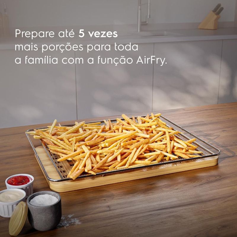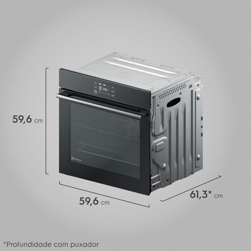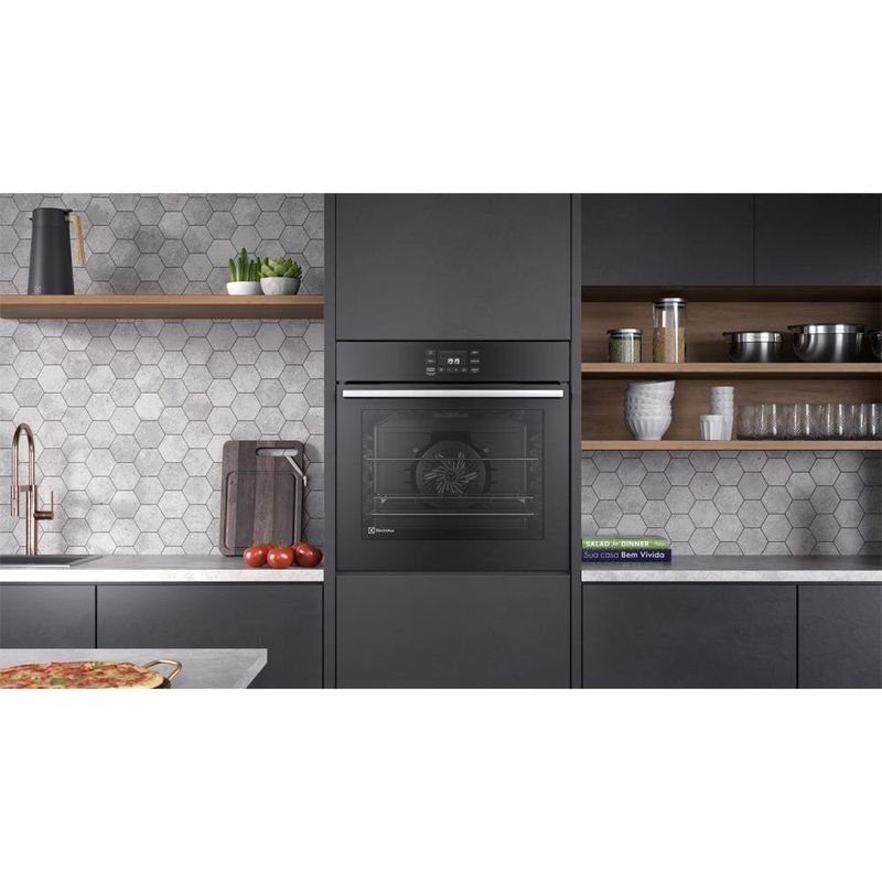 Forno de Embutir Elétrico Electrolux OE8EA 80L com Air Fryer, PerfectCook360 e Painel TouchAssa, frita, gratina e deixa tudo perfeito! O Forno de Embutir Electrolux OE8EA 80L traz alta performance e inovação para sua cozinha. Equipado com Função AirFry, Tecnologia PerfectCook360 e Painel Full Touch, ele oferece precisão, rapidez e mais saúde no preparo das suas receitas.AirFry no Forno – Mais Saúde e PraticidadePrepare pratos sequinhos e saudáveis sem óleo. A Função AirFry reduz até 70% da gordura e 35% das calorias nas suas refeições. Faça até 4x mais porções de uma só vez, ideal para toda a família.PerfectCook360 – Cozimento Uniforme e Mais RápidoA tecnologia PerfectCook360 garante calor homogêneo em todos os cantos do forno, assando suas receitas até 30% mais rápido e por igual.Painel Touch – Controle TotalO Painel Full Touch permite selecionar modos, ajustar temperatura com até 100% de precisão e controlar seu preparo com facilidade.Funções Inteligentes para Seu Dia a Dia Função AirFry: menos gordura, mais saúde. Função Gratinar: dá aquele acabamento dourado e crocante. Função Dourar (Grill): carnes suculentas por dentro e douradas por fora. Timer Digital: o forno desliga sozinho e avisa quando está pronto. 5 modos de preparo: assar tradicional, assar por convecção, base crocante, assar lento e manter aquecido.Fácil de Limpar e Prático de UsarCom Vidro Interno Removível e Esmaltação FastClean, a limpeza fica muito mais fácil. Os cantos arredondados evitam o acúmulo de gordura.Ficha Técnica: Modelo: OE8EA Capacidade: 80 Litros Cor: Preto Inclui: Kit de Bandejas MultifuncionaisDeixe sua cozinha mais moderna, saudável e prática. Compre agora o Forno de Embutir Electrolux OE8EA e revolucione suas receitas!