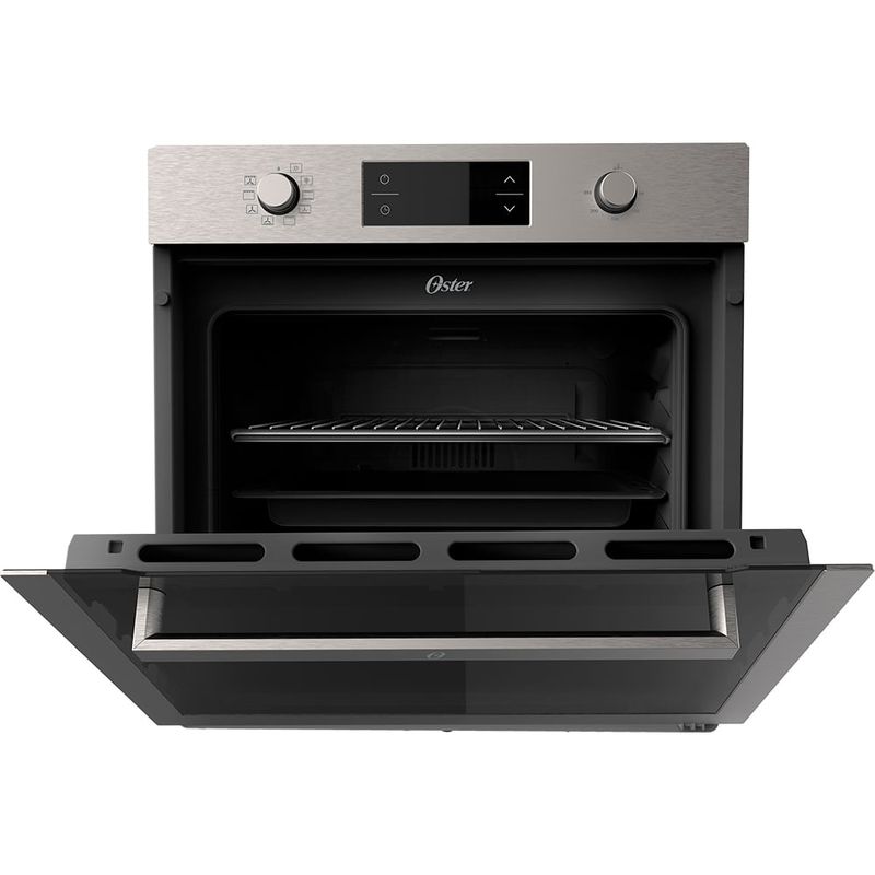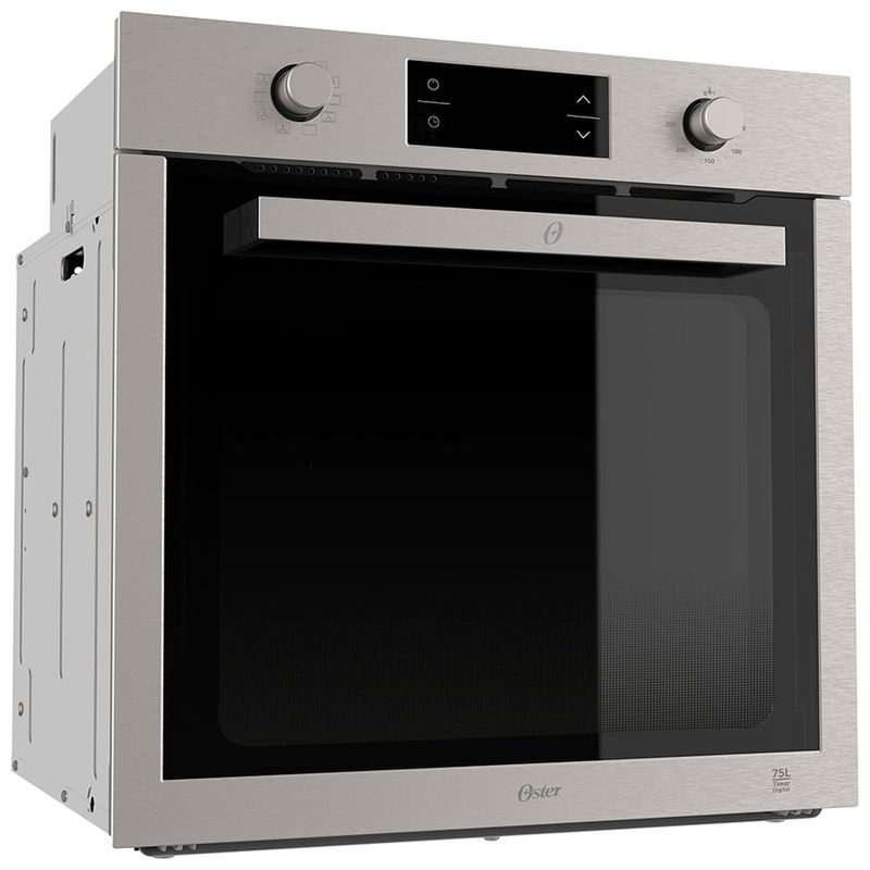 Inove nas suas receitas. Renove a sua cozinha! Revolucione as suas receitas com o novo Forno Elétrico de Embutir Oster. Com o sistema de convecção, o forno oferece circulação de ar e melhor distribuição da temperatura. Além da possibilidade de programação automática para até 24 horas, que traz muita praticidade para cozinhar. Painel Semi Digital: Visual moderno, mais tecnologia e precisão durante o uso. Programação Automática: São 9 programações de receitas que vão trazer mais praticidade e precisão aos seus preparos. Assa por Convecção: Tecnologia que distribui o calor, assando o alimento de maneira uniforme e muito mais rápido. Ao acionar esta função, você pode preparar proteínas como frangos inteiros garantindo um resultado uniforme. Timer programável de 24 horas: Desligamento automático e programações para até 24 horas, inclusive Ligar e Desligar. Assim, você pode programar o seu preparo com segurança, sabendo o horário que ele vai iniciar e terminar. Segurança, praticidade e eficiência. Sinal Sonoro: Receba avisos para o acompanhamento da sua receita. Porta e vidro destacáveis: Retire a porta e o vidro triplo para higienização interna: mais praticidade, limpeza e segurança. 75 litros de capacidade: Tamanho ideal para preparar diferentes tipos de receitas: de sobremesas a assados. Ajuste de altura e bandeja coletora: Posicione a grade de acordo com o resultado desejado. A bandeja coletora garante facilidade para a limpeza. Selo de Segurança OCP SGS