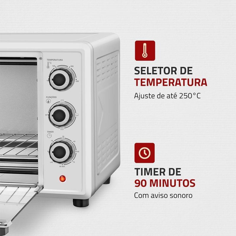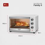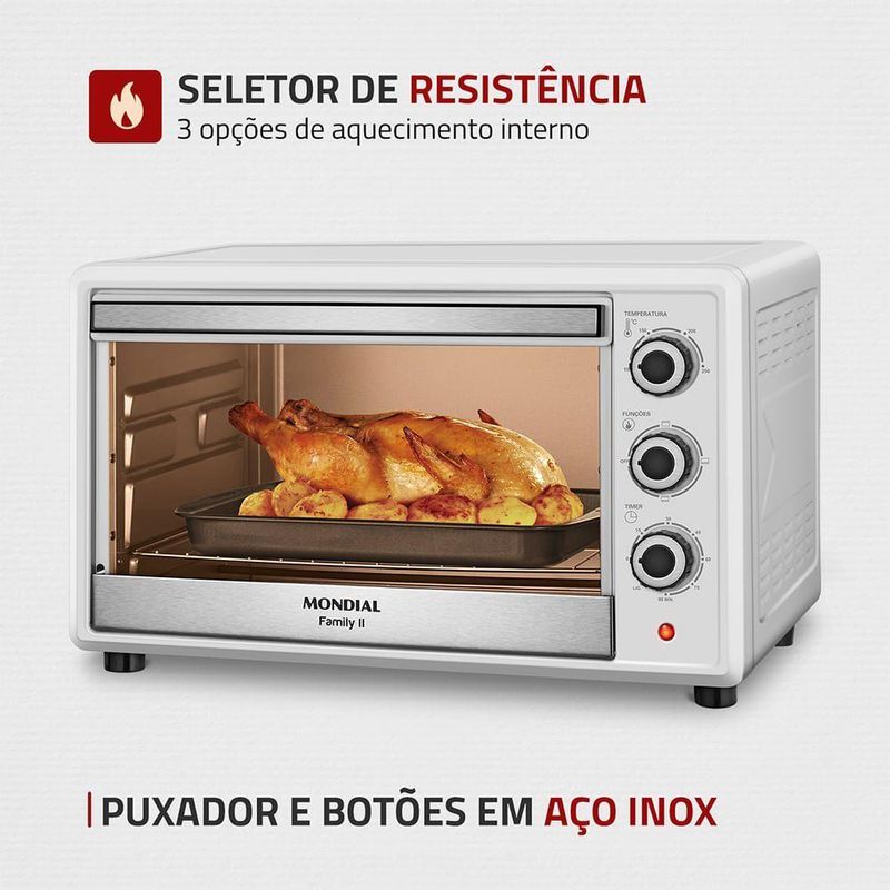 Forno Elétrico 42l Family Ii Mondial Branco/inox- Fr-42-w Forno Elétrico Fr-42-w 127v/60hzAgora você pode fazer aquela receita tamanho família sem preocupação. O forno elétrico Family II FR-42-W da Mondial possui capacidade para 42 litros e é perfeito para aquecer, cozinhar, tostar, assar, gratinar e grelhar de maneira eficiente. Possui controle de temperatura, grelha com regulagem de altura, timer de 90 minutos com desligamento automático e alta potência de 1600W. Saiba mais sobre o FR-42-W-W da Mondial:CAPACIDADE DE 42 LITROS: Alto desempenho e ótimo espaço! Ideal para o preparo de receitas para toda a família.MULTIFUNÇÕES: Ideal para aquecer, cozinhar, tostar, assar, gratinar e grelhar de maneira rápida e eficiente.POTÊNCIA DE 1600W: Alta potência que assegura mais agilidade e eficiência no preparo de receitas variadas.SELETOR DE RESISTÊNCIA: São 3 opções de aquecimento interno para distribuir melhor o calor.TIMER DE 90 MINUTOS: Mais liberdade e segurança para você fazer outras tarefas enquanto o forno trabalha. Com aviso sonoro, o aparelho desliga automaticamente ao término do preparo.MAIS PRATICIDADE: A regulagem de altura da grelha oferece versatilidade para um cozimento ideal.CONTROLE DE TEMPERATURA: De 100°C até 250°C: Ajuste a intensidade da temperatura de acordo com a receita que vai preparar.PUXADOR E BOTÕES EM AÇO INOX: Design moderno, com mais durabilidade e resistência.UM ANO DE GARANTIA MONDIAL: A Mondial é a escolha de milhões de consumidores. Mondial, a escolha inteligente!Modelo - FR-42-WCor - Branco/InoxVoltagem (Tensão) - 127V/220VItens inclusos - 1 Forno Elétrico; 1 Grelha com Regulagem de Altura; 1 Manual de Instruções com Livro de ReceitasMaterial - PP, Aço Inox e VidroCapacidade (L) - 42LPotência - 1600WSeletor de Temperatura - SimTimer - SimAção do produto - Assar, cozinhar, gratinar e fritar seus alimentosBandeja para resíduos - NãoGrelha - SimAjuste de altura da grelha - SimLuz indicadora - SimLuz interna - SimAlimentação - Energia ElétricaDimensões do produto - 33,50cm x 53,00cm x 37,50cm (AxLxP)Peso do produto - 5,99kgComprimento do cabo - 0,85mConsumo de energia - 1,6Kw/hGarantia - 1 AnoTipo de Forno - Forno ElétricoTipo de Montagem - MesaMarca - Mondial