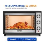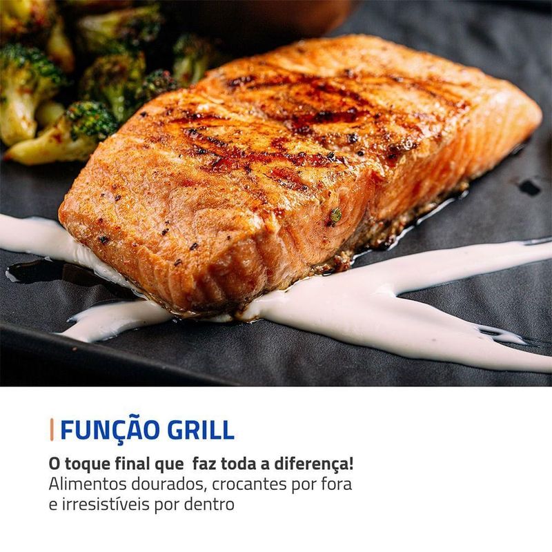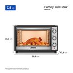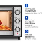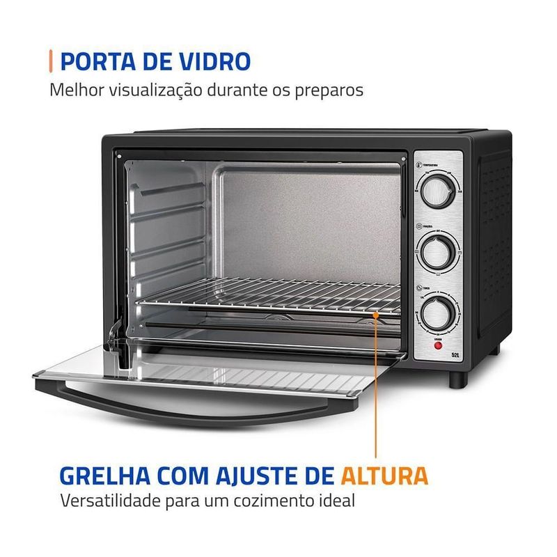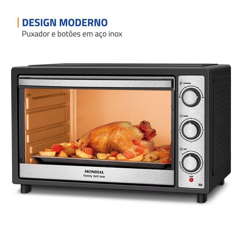 Forno Elétrico 52L Family Grill Inox Mondial Preto/inox 1800W FRN-52-BI 110VO Forno Elétrico Mondial Family Grill Inox traz espaço e praticidade para o preparo das suas receitas. Com 52 litros de capacidade, é ideal para refeições completas em família. A função grill é perfeita para gratinar queijos e finalizar os pratos com um dourado uniforme, proporcionando crocância por fora e um interior macio e saboroso.Com alta potência, o aquecimento é rápido e oferece resultados perfeitos ao assar, gratinar ou grelhar. Conta ainda com controle de temperatura de até 250°C e timer de 90 minutos com desligamento automático, oferecendo mais comodidade no seu dia a dia na cozinha. Saiba mais sobre o FRN-52-BI da Mondial:Capacidade de 52 Litros: Mais espaço para cozinhar com tranquilidade e fazer receitas para toda a família.Multifunções: Versátil e prático, permite aquecer, assar, tostar, gratinar, grelhar e dourar com rapidez e eficiência, oferecendo resultados perfeitos em diversos tipos de receitas.Função Grill: Perfeita para gratinar queijos e finalizar receitas com um dourado uniforme e textura crocante.Potência de 1.800W: Ideal para um preparo ágil e eficiente de diferentes receitas.Timer de 90 Minutos: Permite programar o tempo de preparo com praticidade e . Conta com desligamento automático e aviso sonoro, oferecendo mais comodidade para você realizar outras tarefas enquanto o forno faz o trabalho.Seletor de Resistência : São 3 opções de aquecimento interno para distribuir melhor o calor.Controle de Temperatura: De 100°C até 250°C, ajuste a intensidade da temperatura de acordo com a receita que vai preparar.Mais Praticidade: A regulagem de altura da grelha em três níveis oferece versatilidade para um cozimento ideal, conforme o tipo de alimento.Acabamento em Aço Inox: Traz um toque moderno e elegante à sua cozinha, além de maior resistência, facilidade na limpeza e brilho por mais tempo.Especificações TécnicasUm Ano de Garantia Mondial: A Mondial é a escolha de milhões de consumidores.Mondial, a escolha inteligente!Modelo - FRN-52-BICor - Preto/InoxVoltagem (Tensão) - 127V / 220VItens inclusos - 01 Forno Elétrico, 01 Grelha regulável de altura, 01 Bandeja de resíduos, 01 Manual de instruções.Material - PP, aço inox e vidro.Capacidade (L) - 52 litrosPotência - 1800WSeletor de Temperatura - 100°C a 250°CTimer - 90 minutos com desligamento automático e aviso sonoroAção do produto - Assar, aquecer, tostar, gratinar, grelhar e dourarBandeja para resíduos - SimGrelha - SimAjuste de altura da grelha - 3 níveisLuz indicadora - NãoLuz interna - SimAlimentação - Energia ElétricaDimensões do produto - 6,35 cm (A) x 56,60 cm (L) x 42,91 cm (P).Peso do produto - 7,90 kgComprimento do cabo - Não informadoConsumo de energia - Não informadoGarantia - 12 mesesTipo de Forno - Forno elétrico de bancadaMarca - Mondial