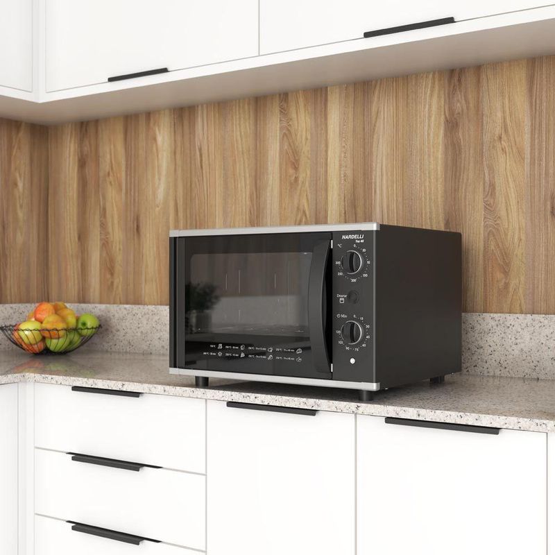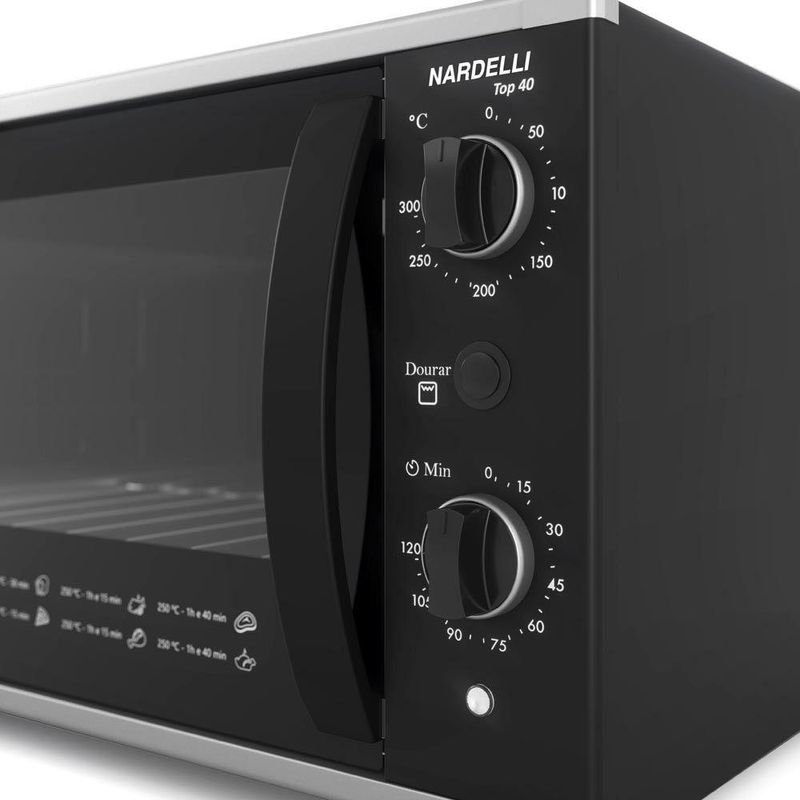 Forno Elétrico De Bancada 40 Litros Nardelli Top 40 Black Preto 220VDescubra a versatilidade com nosso Forno de Bancada de 40 Litros. Prepare refeicoes deliciosas e economize espaco na sua cozinha.Forno de BancadaAtencao escolha a voltagem do produto antes de finalizar a compraCaracteristicasCapacidade 40 LitrosTimer de 120 minutosTermostato ate 300 grausBandeja para residuosGrade InternaLuz piloto Indica se o forno esta ligadoGrill e DouradorInterior Easy Clean, EsmaltadoIsolamento termicoCompacto, pratico e modernoEspecificacoes TecnicasTensao 110V ou 220V, a voltagem deve ser escolhida e selecionada no ato da compraCorrente 15 A para 127 V e 8 A para 220 VFrequencia 60 HzPotencia resistencia Superior 700 WPotencia resistencia Inferior 1000 WPotencia total 1700 WConsumo 1,2 kWhTomada para fornos 220 V devem ser de 10 ATomada para fornos 127 V devem ser de 20 AAtencao Padroes especificados e de acordo com as normas do InmetroDimensoes externas do produto A 34 cm x L 50 cm x P 47,5 cmDimensoes internas do produto A 20 cm x L 37 cm x P 39,5 cmEspaco interno 40 LitrosPeso 12,8 kgGarantia de Fabrica 12 mesesInstalacao por conta do clienteImagens meramente ilustrativas