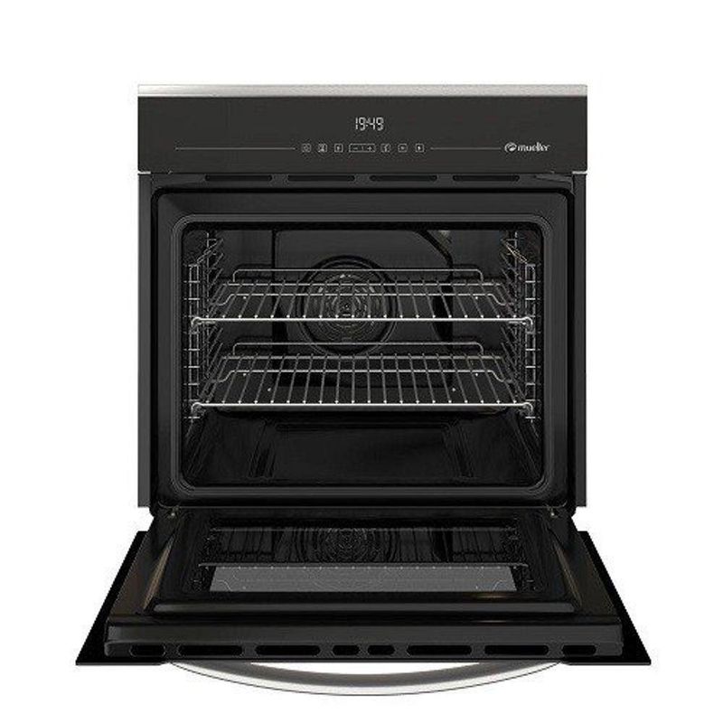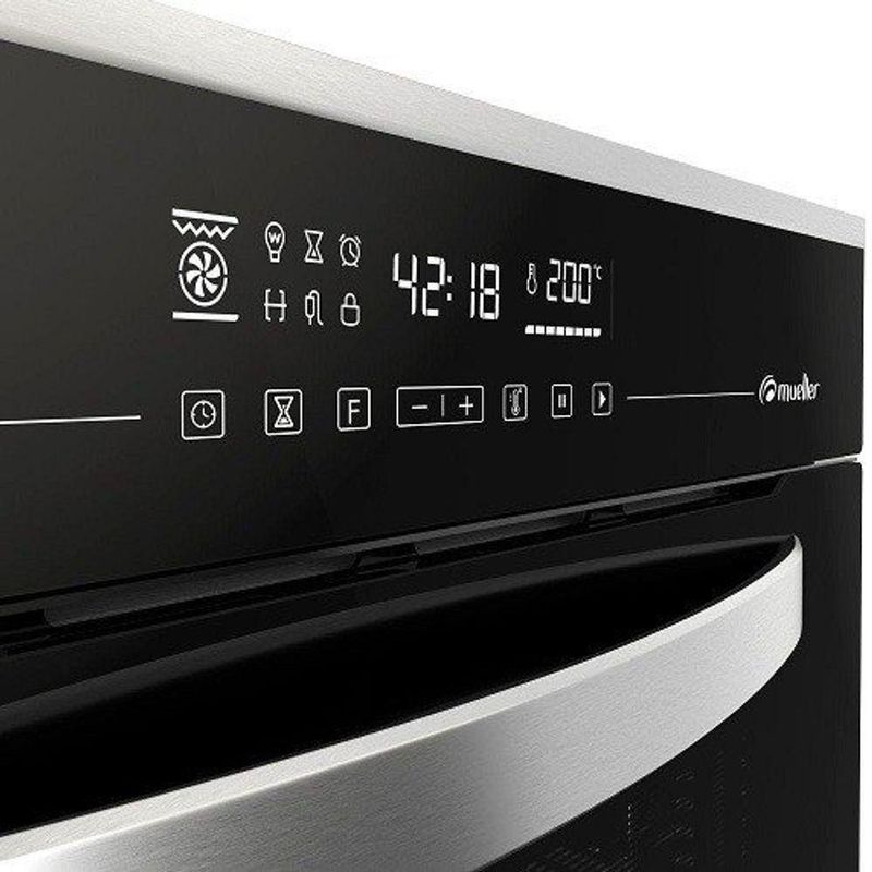 Forno Elétrico Digital De Embutir Mueller Preto 68 Litros Mfe0268g1 220vForno Elétrico Digital de Embutir Mueller Preto 68 Litros MFE0268G1 220V -Características Gerais do Produto: - Abertura de porta: Vertical com duplo estágio - Acabamento do interior do forno: Corpo interno esmaltado easy clean - Bandeja para resíduos: Não é removível - com acabamento esmaltado easy clean - Capacidade (Litros): 68 Litros - Dimensões da embalagem (cm): A:66,8 x L:68,8 x P:64,8 - Dimensões do nicho de instalação (cm): L: 56 x P: 57 - Dimensões externas (cm): A:59,5 x L:59,5 x P:57,5 - Dimensões internas do forno (cm): A:34, x L:48 x P:41,5 - Dourador (Grill): Sim - Funções: Função Turbo: distribuição uniforme de calor; Assa, doura, tosta, gratina e aquece; Temperatura ajustável para cada tipo de assado - Luz Interior: Sim - Material do corpo: Chapa de Aço - Peso: Peso líquido: 30,30 kg / Peso bruto: 36,00 kg - Porta do forno: Vidro duplo - Potência total (Watts): 2.800W - Prateleiras do forno: 2 prateleiras com 9 níveis de altura - Saída de ar / sistema de ventilação: Ventilação interna - Tensão: 220V; 127V - Timer: Relógio e timer com autodesligamento - Tipo de controle: Painel Touch Screen - Tipo de forno: Forno Elétrico de Embutir - Variação de temperatura (mínima/máxima): 50ºC a 250ºC - Modelo referência do produto: 681050003 - Atenção: O plugue do cabo de alimentação de seu produto está em conformidade com a NBR 14136/2002 do Inmetro e deverá ser mantido.Acompanha o produto: - Manual de Instruções - Rede de postos autorizados Garantia: - 12 Meses de Garantia de Fábrica