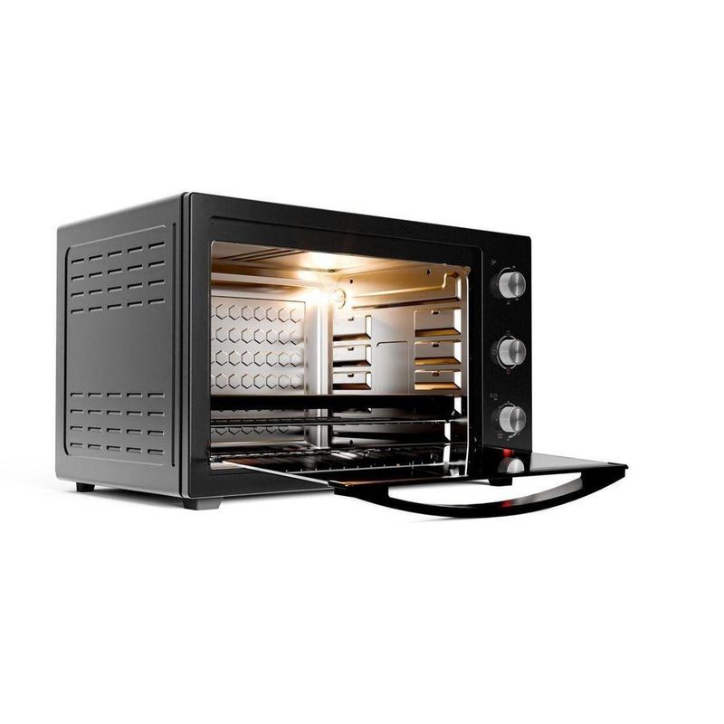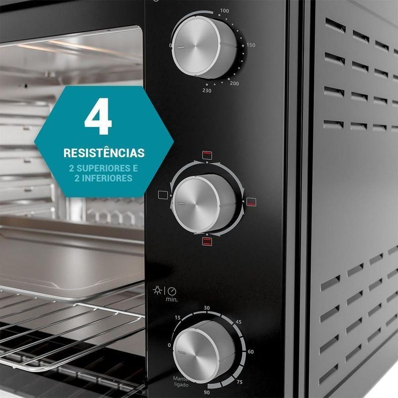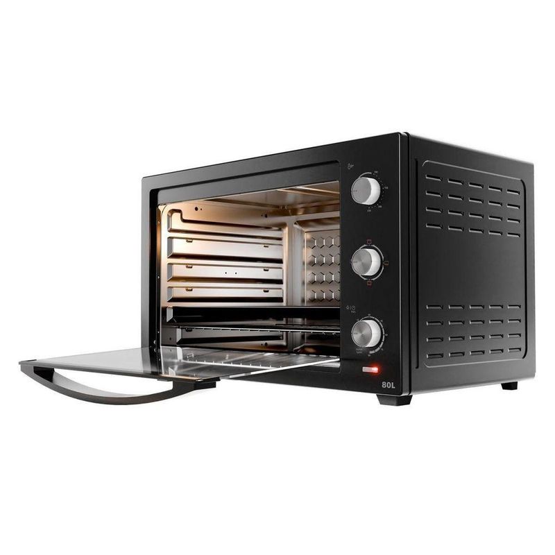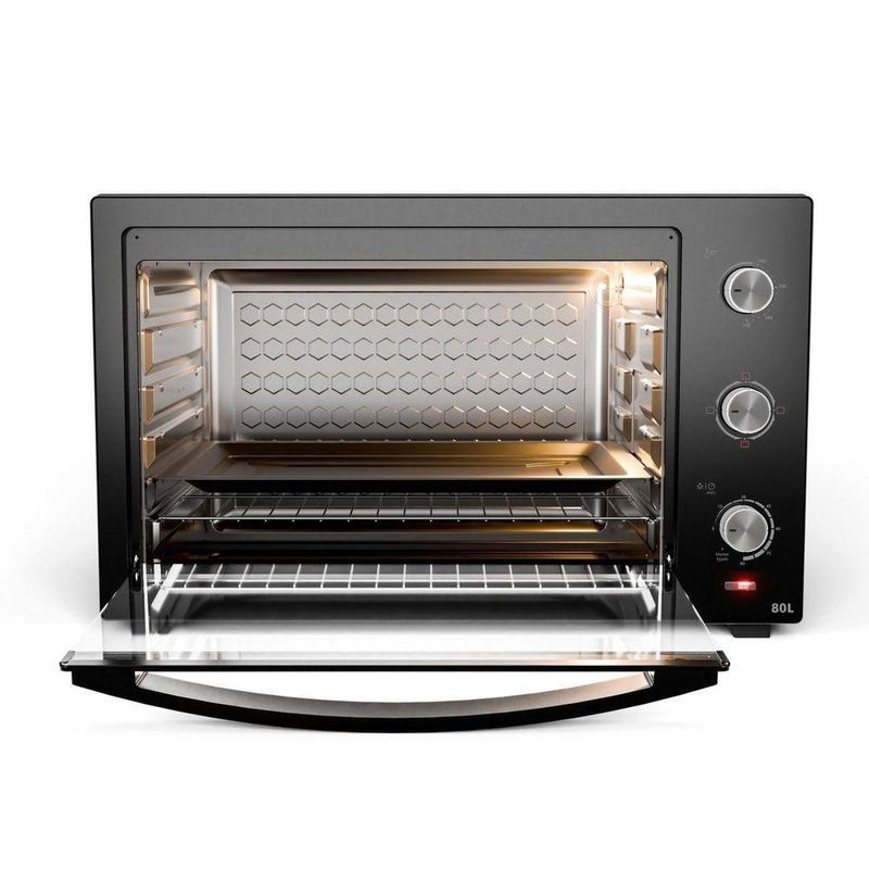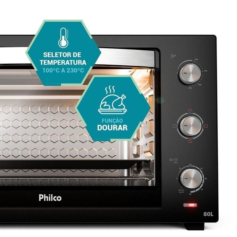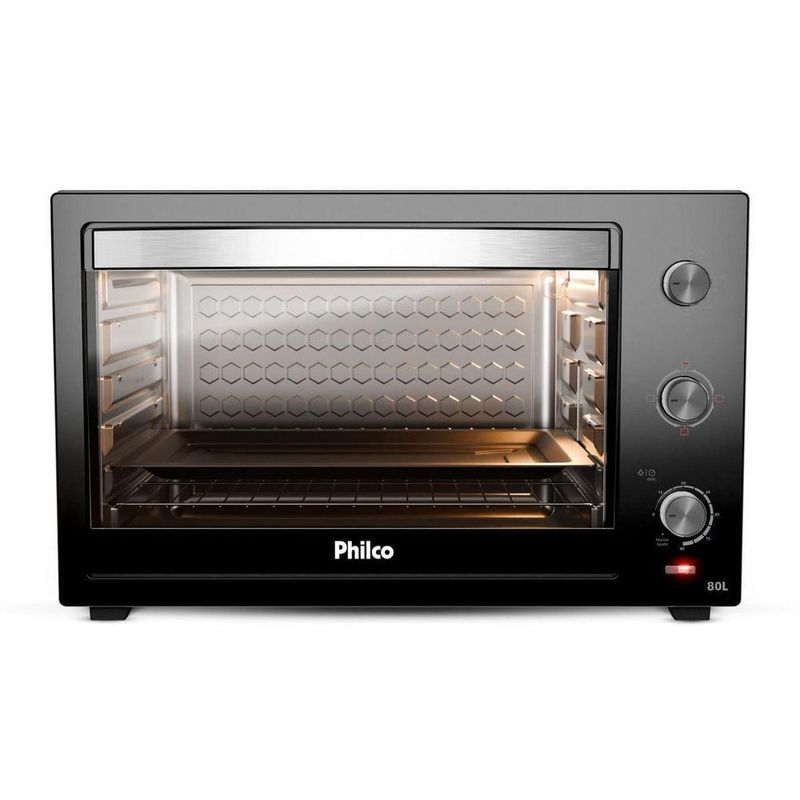 Forno Elétrico Philco 80L Preto 4 Resistências PFE80A 110VUm banquete delicioso preparado com facilidade e rapidez em sua própria casa! Com o Forno Elétrico 80L Philco 4 resistências PFE80A, você pode preparar uma infinidade de receitas com perfeição, do pão de queijo quentinho ao assado suculento. Possui alta potência de 2800W (220V) e 1900W (127V), e atinge a temperatura desejada em apenas 12 minutos, agilizando o preparo das suas receitas favoritas. O Forno Elétrico Philco é a escolha certa para quem busca praticidade e sabor, com 4 resistências garante um cozimento uniforme e perfeito por dentro e por fora. Com a temperatura ajustável de 100°C a 250°C, você pode assar, tostar, gratinar, grelhar e até mesmo descongelar os alimentos. Além de preparar desde bolos delicados até assados mais robustos.O timer é de 90 minutos e possui desligamento automático, assim você tem total controle sobre o tempo de cozimento e evita que suas receitas queimem. Não perca mais tempo na cozinha! Adquira agora mesmo o Forno Elétrico 80L Philco 4 resistências, surpreenda sua família e amigos com pratos deliciosos e feitos com muito carinho. Principais Características- Capacidade: 80L- Potência: 127V: 1900W e 220V: 2800W- Timer: 90 min- Temperatura de funcionamento: 100°C a 230°C- Número de resistências: 4 resistências, 2 superior e 2 inferior- Tipo de forno: Bancada- Funções: 4 funções: Somente resistência inferior, somente resistência superior, ambas acionadas.- Bandeja coletora: Dimensões L: 49,8cm; A: 3,2cm P: 38cm- Tipo de porta: Vidro- Tipo de revestimento interno: Esmaltado- Grelha: Em aço cromado. Dimensões: L: 49,8cm; x P: 37,5cm- Níveis de ajuste de altura da grelha: 5 níveis- Medidas da cavidade interna: L: 50cm; A: 36,5cm; P: 42,5cm.Especificações TécnicasMarca: PhilcoModelo: PFE80ACor: PretoCapacidade (L): 80LEstado: NovoTipo de montagem: De bancadaTipo: ElétricoPotência (W): 1900W (127V) – 2800W (220V)Desligamento automático: SimFunção timer: SimTemperatura: 100 a 250 °CAltura do produto: 43,5 cmLargura do produto: 68 cmComprimento do produto: 47,5 cmPeso do produto: 12,34 kgAltura com embalagem: 50 cmLargura com embalagem: 73 cmComprimento com embalagem: 52 cmPeso com embalagem: 14,38 kgGarantia (Dias): 360